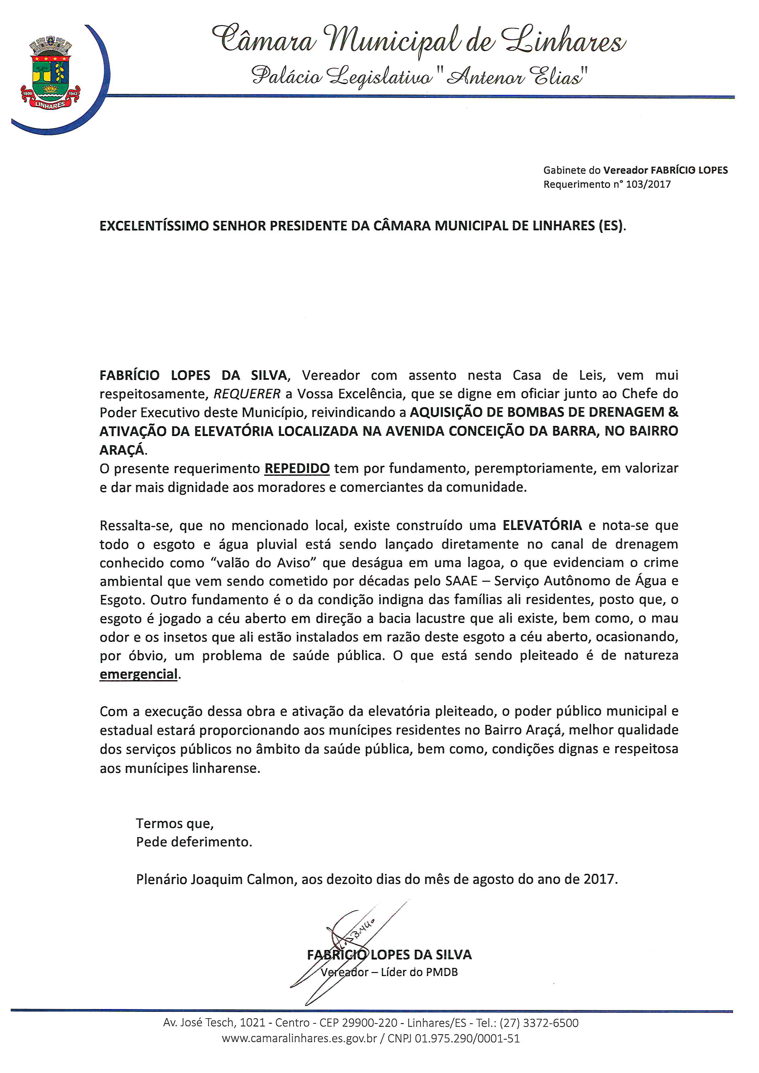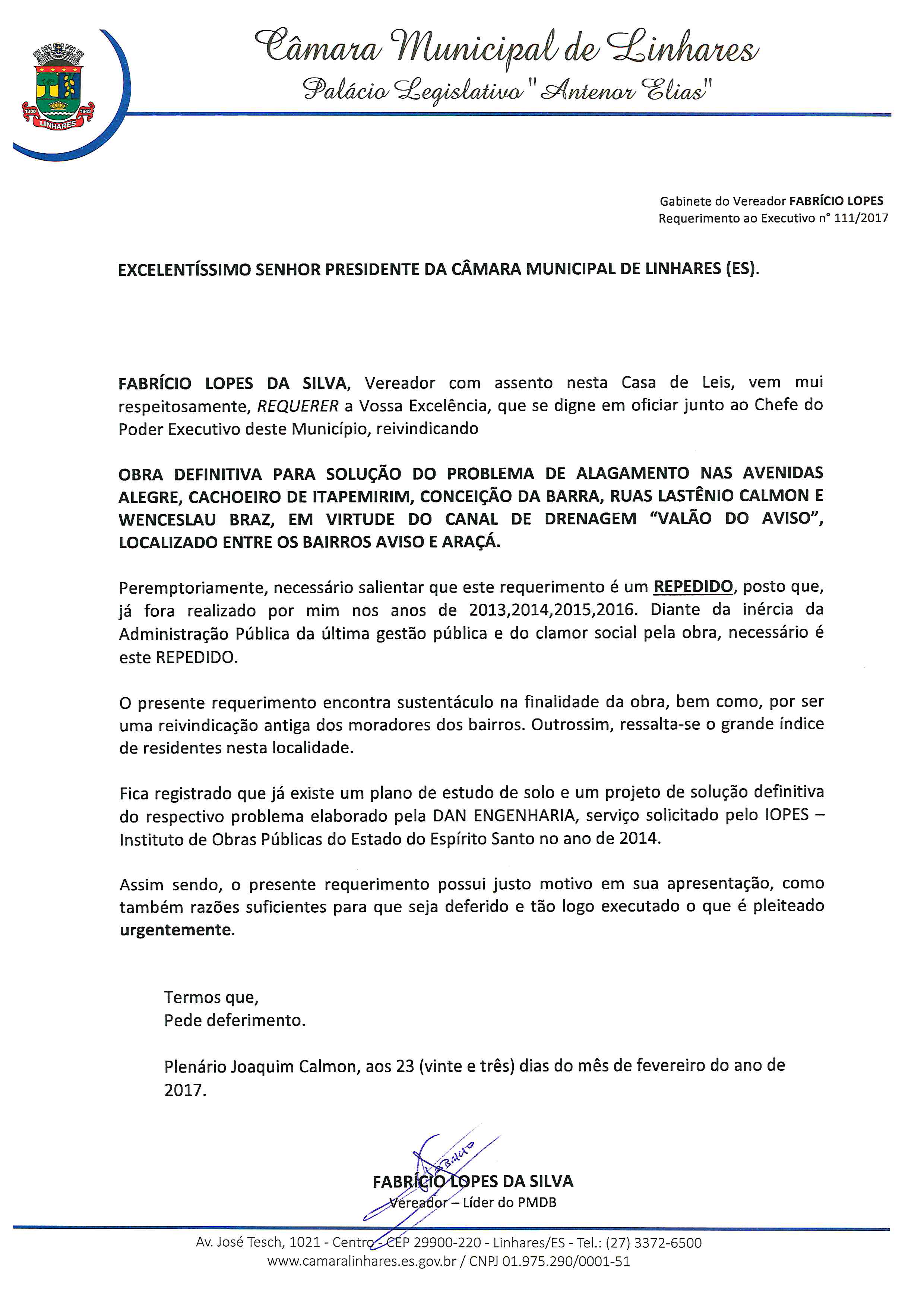 Ementa: REIVINDICANDO OBRA DEFINITIVA PARA SOLUÇÃO DO PROBLEMA DE ALAGAMENTO NAS AVENIDAS, ALEGRE, CACHOEIRO DE ITAPEMIRIM, CONCEIÇÃO DA BARRA, RUAS LASTÊNIO CALMON E WENCESLAU BRAZ, EM VISTUDE DO CANAL DE DRENAGEM VALÃO DO AVISO LOCALIZADO ENTRE OS BAIRROS AVISO E ARAÇÁ.