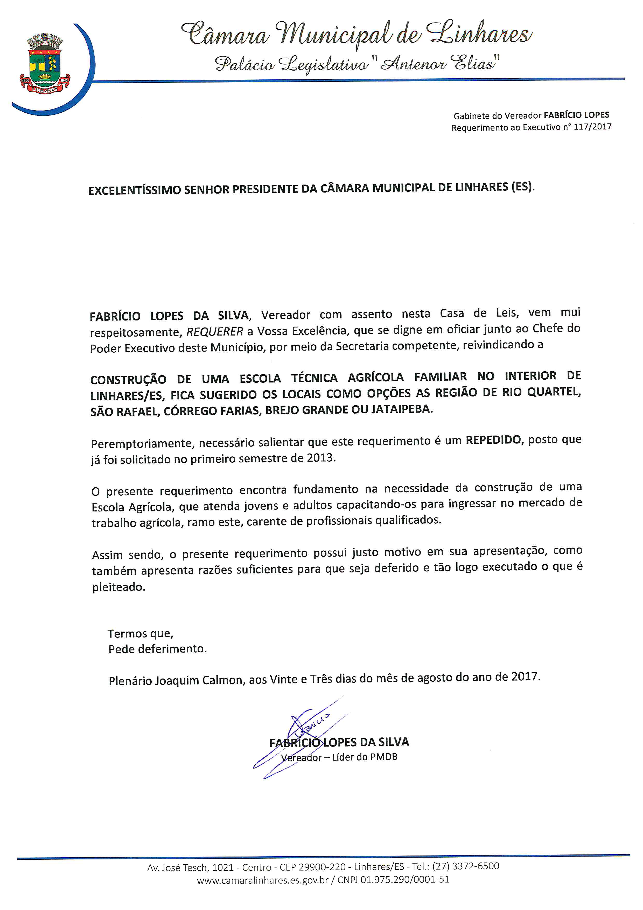 Ementa: REIVINDICANDO CONSTRUÇÃO DE UMA ESCOLA TÉCNICA AGRÍCOLA FAMILIAR NO INTERIOR DE LINHARES/ES, FICA SUGERIDO OS LOCAIS COMO OPÇÕES AS REGIÕES DE RIO QUARTEL, SÃO RAFAEL, CÓRREGO FARIAS, BREJO GRANDE OU JATAIPEBA.