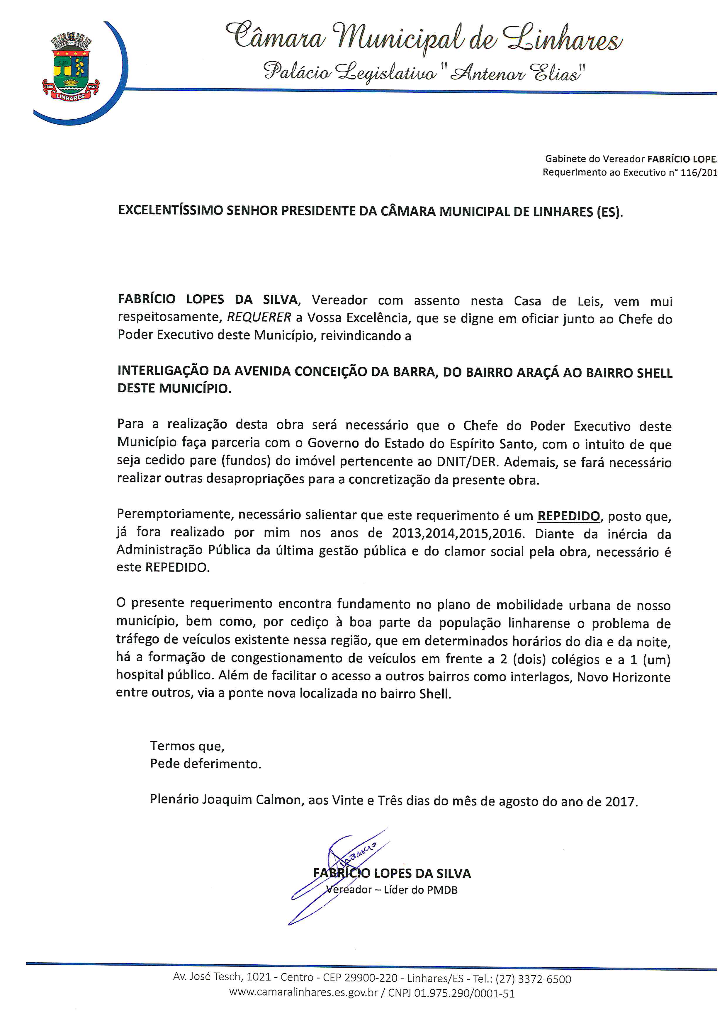 Ementa: REVINDICANDO INTERLIGAÇÃO DA AVENIDA CONCEIÇÃO DA BARRA, DO BAIRRO ARAÇÁ AO BAIRRO SHELL DESTE MUNICÍPIO.