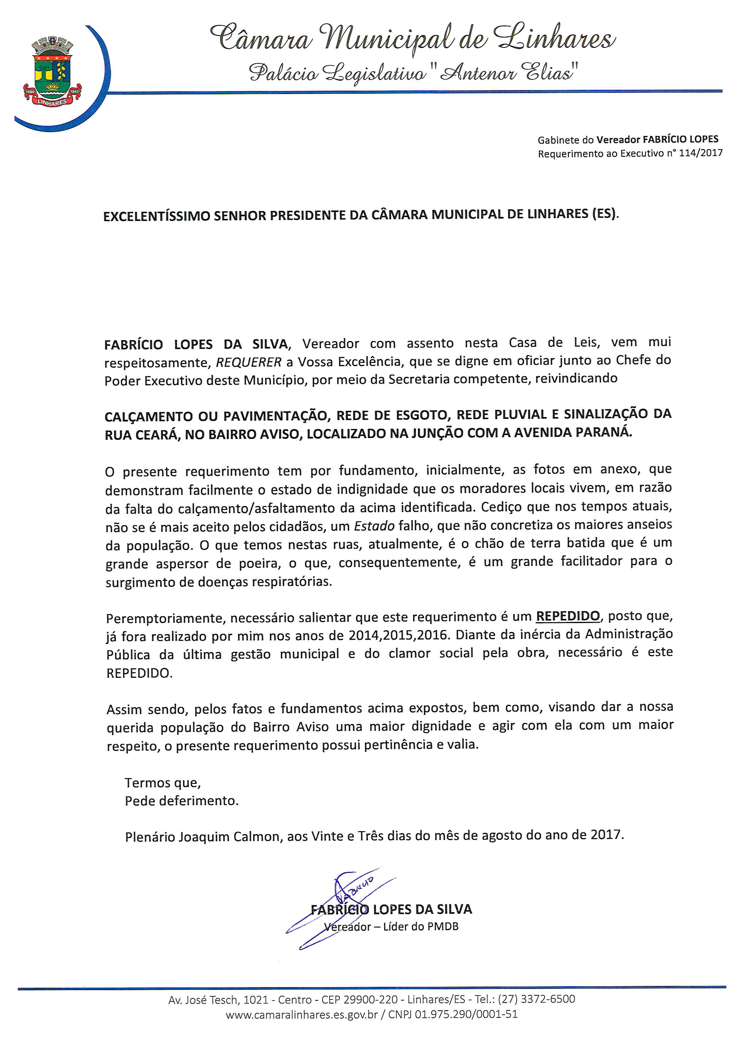 Ementa: REIVINDICANDO CALÇAMENTO OU PAVIMENTAÇÃO, REDE DE ESGOTO, REDE PLUVIAL E SINALIZAÇÃO DA RUA CEARÁ, NO BAIRRO AVISO, LOCALIZADO NA JUNÇÃO COM AVENIDA PARANÁ.