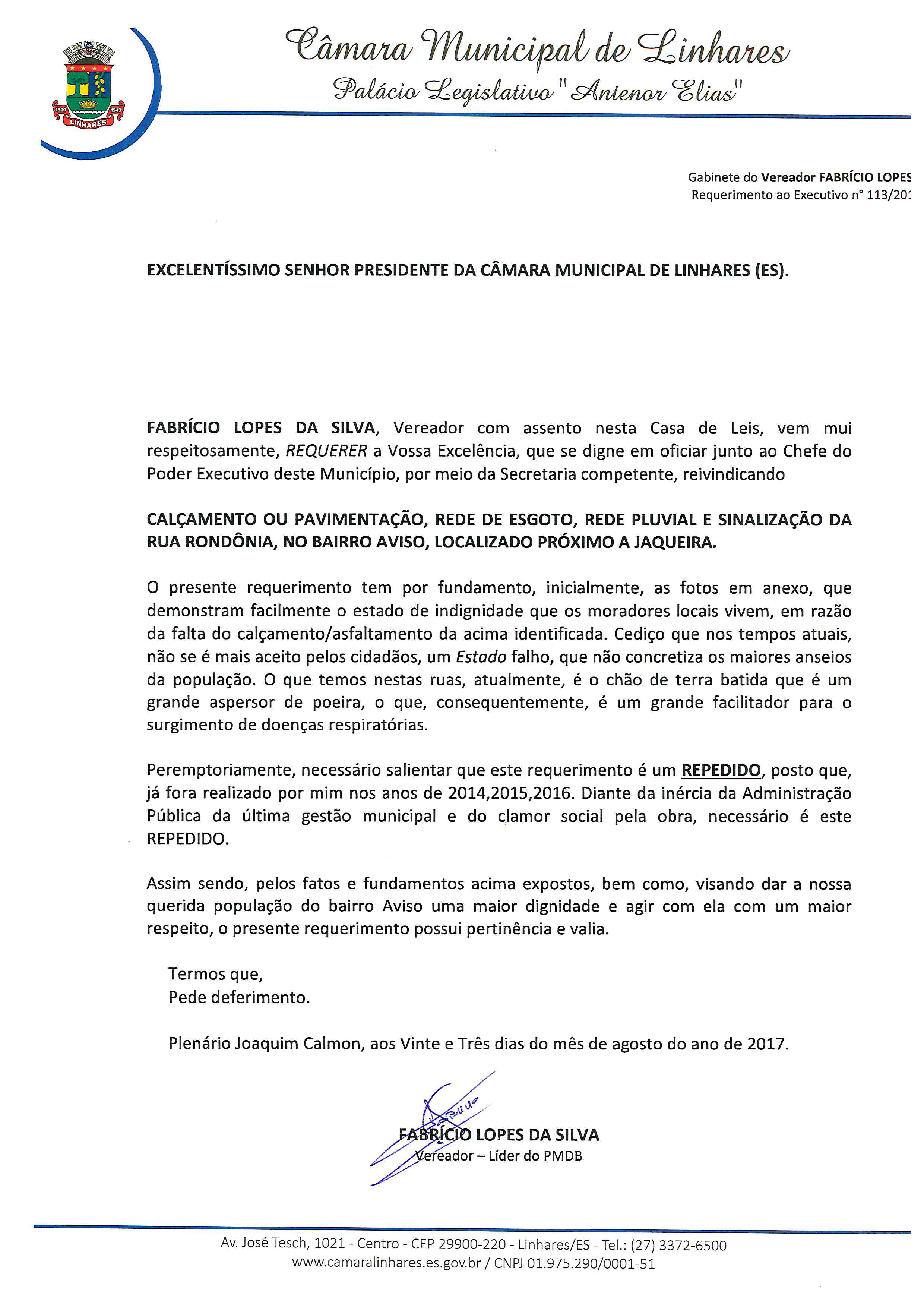 Ementa: REIVINDICANDO CALÇAMENTO OU PAVIMENTAÇÃO, REDE DE ESGOTO, REDE PLUVIAL E SINALIZAÇÃO DA RUA RONDÔNIA, NO BAIRRO AVISO, LOCALIZADO PRÓXIMO A JAQUEIRA.