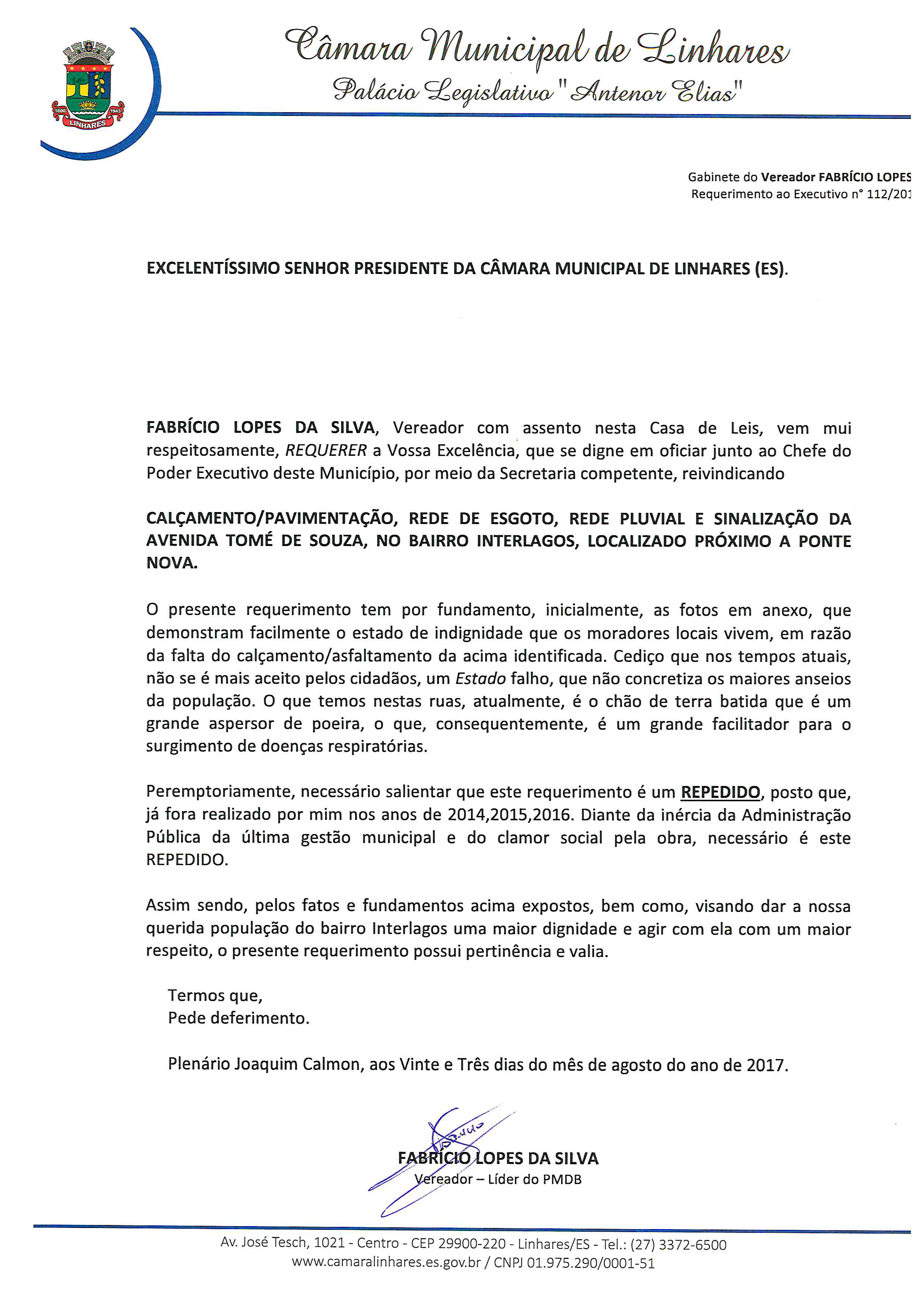 Ementa: REIVINDICANDO CALÇAMENTO/ PAVIMENTAÇÃO, REDE DE ESGOTO, REDE PLUVIAL E SINALIZAÇÃO DA AVENIDA TOMÉ DE SOUZA, NO BAIRRO INTERLAGOS, LOCALIZADO PRÓXIMO A PONTE NOVA.