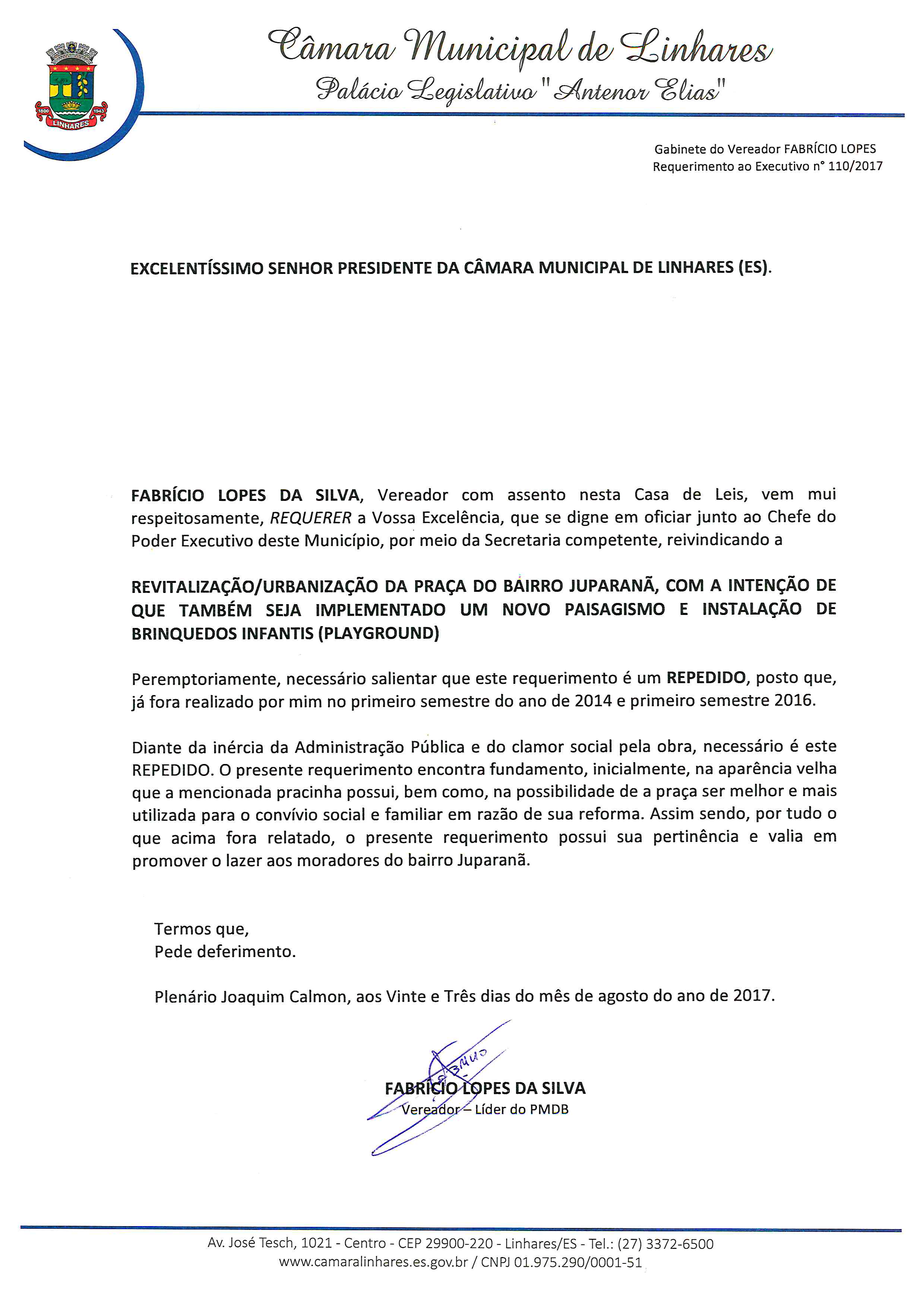Ementa: REIVINDICANDO A REVITALIZAÇÃO / URBANIZAÇÃO DA PRAÇA DO BAIRRO JUPARANÃ, COM A INTENÇÃO DE QUE TAMBÉM SEJA IMPLEMENTADO UM NOVO PAISAGISMO E INSTALAÇÃO DE BRINQUEDOS INFANTIS ( PLAYGROUND)