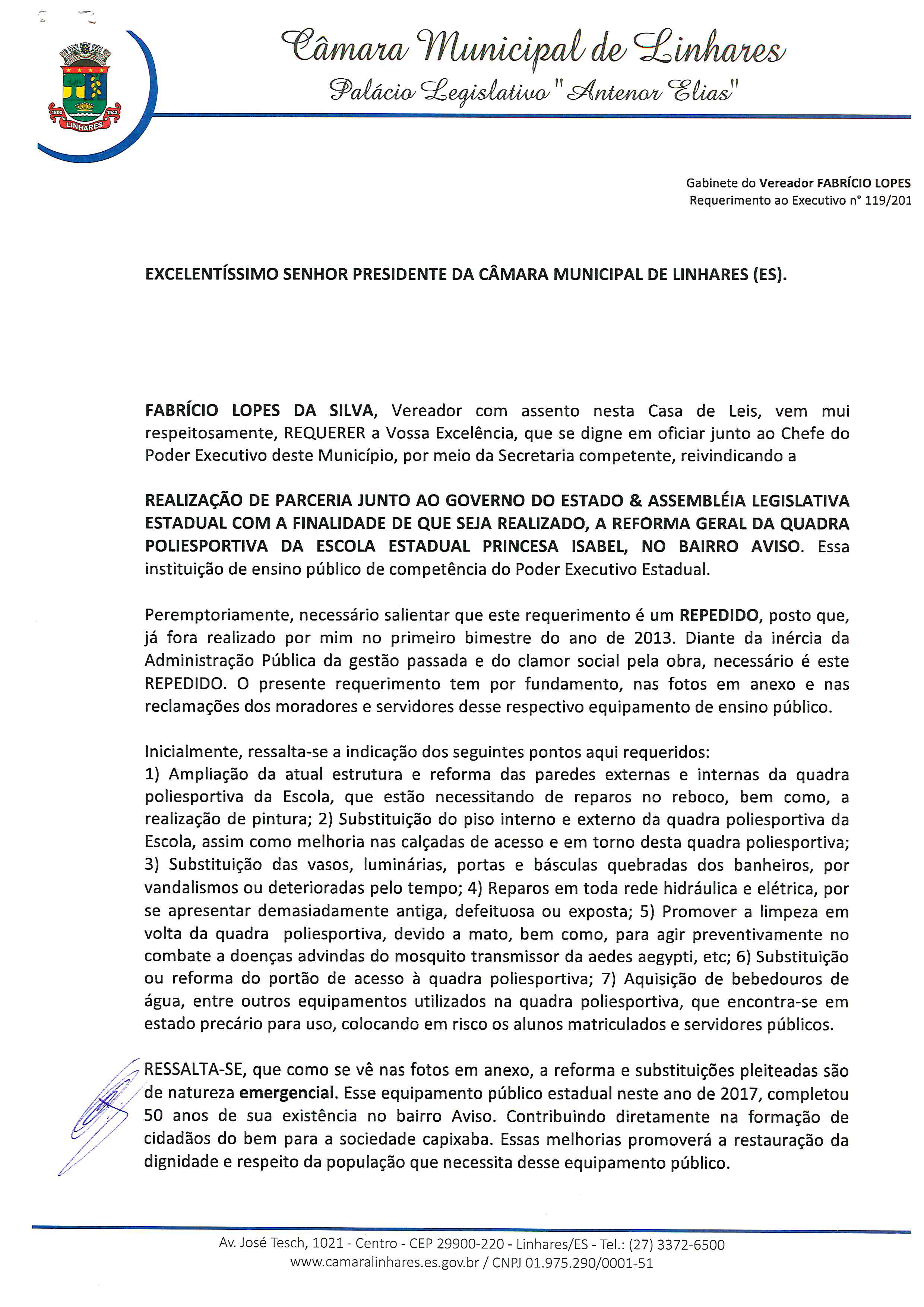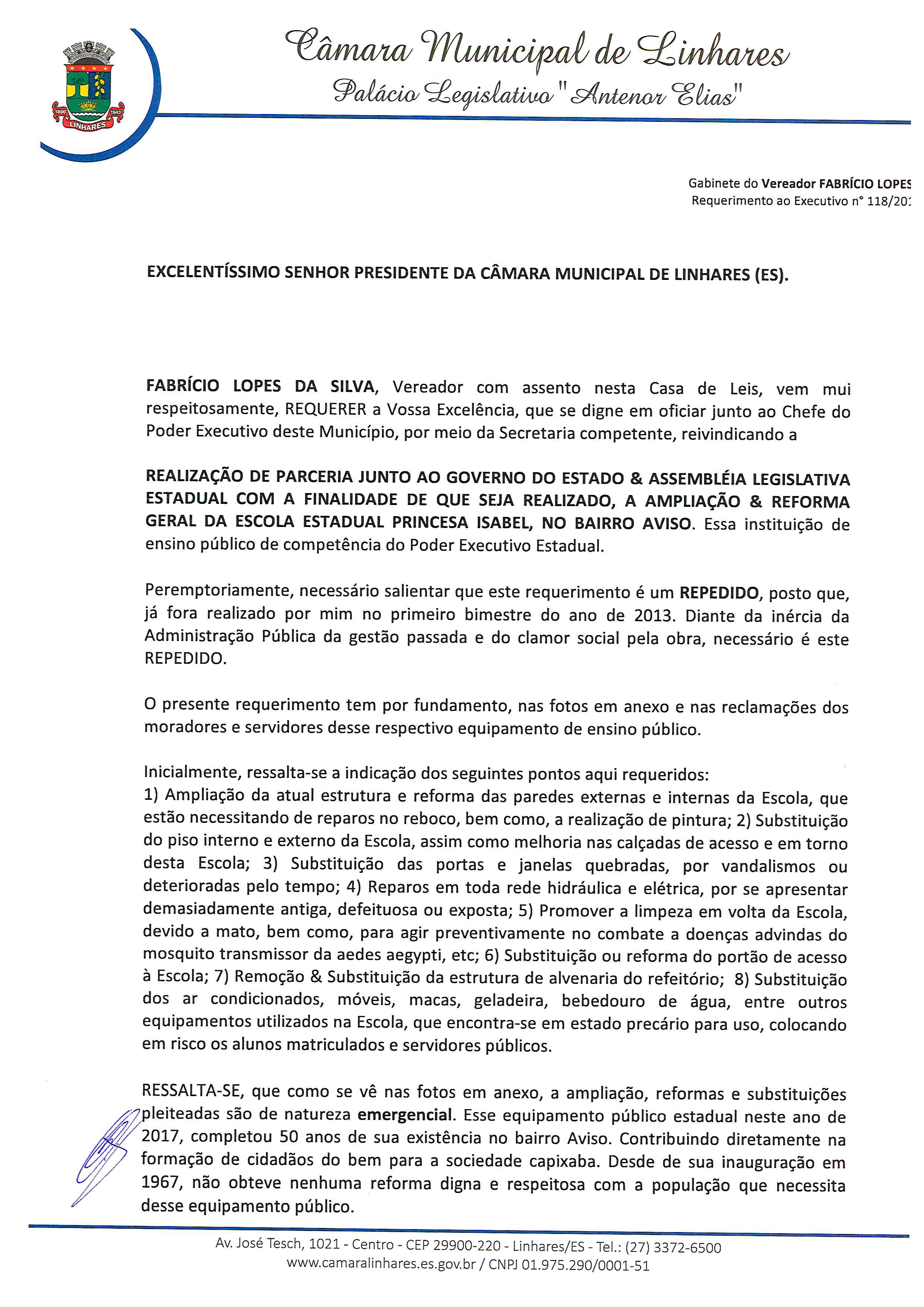 Ementa: REIVINDICANDO A REALIZAÇÃO DE PARCERIA JUNTO AO GOVERNO DO ESTADO & ASSEMBLÉIA LEGISLATIVA ESTADUAL COM A FINALIDADE DE QUE SEJA REALIZADO, A AMPLIAÇÃO & REFORMA GERAL DA ESCOLA PRINCESA ISABEL, NO BAIRRO AVISO.