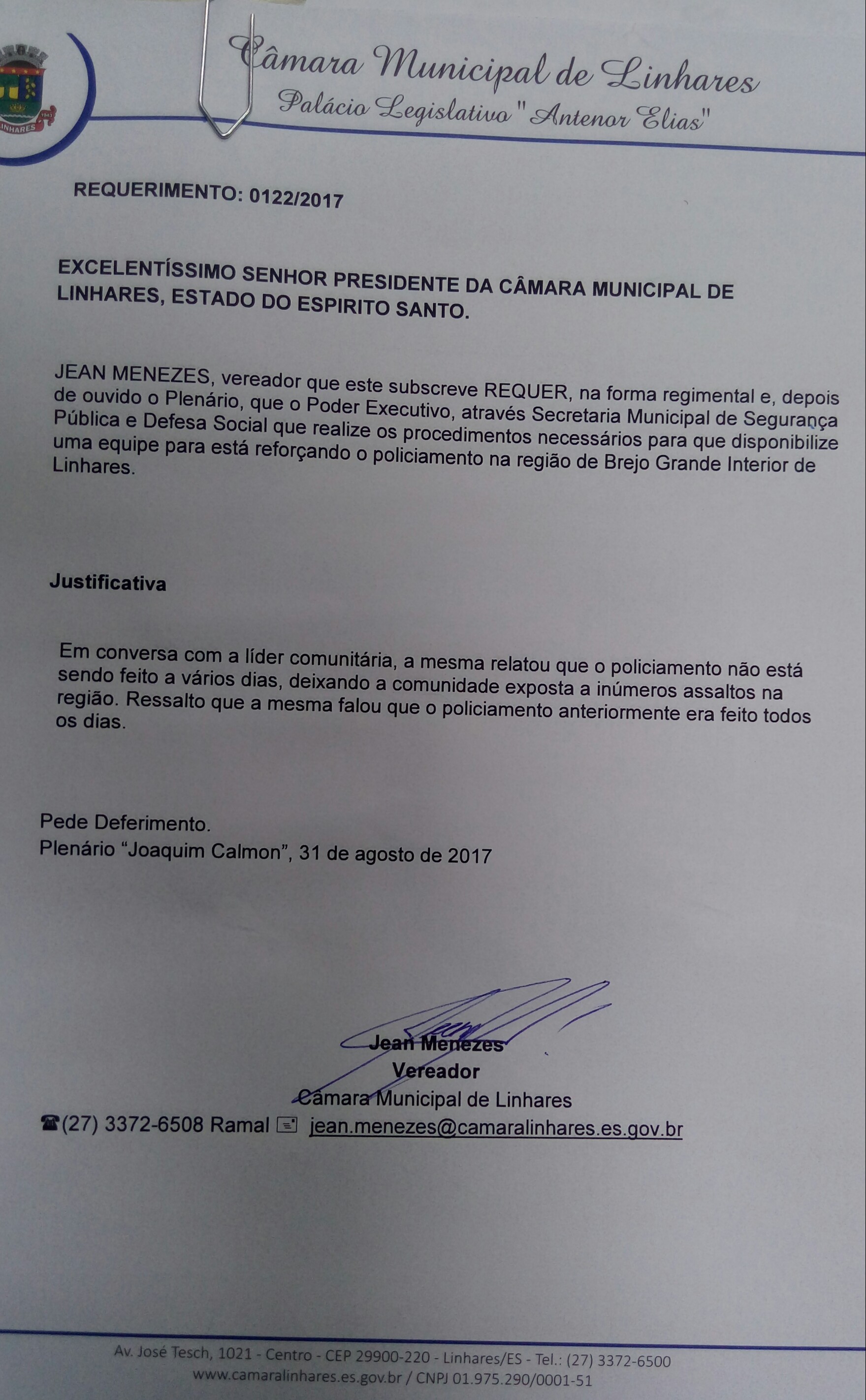 Ementa: JEAN MENEZES, VEREADOR QUE ESTE SUBSCREVE REQUER, NA FORMA REGIMENTAL E, DEPOIS DE OUVIDO O PLENÁRIO, QUE O PODER EXECUTIVO, ATRAVÉS SECRETARIA MUNICIPAL DE SEGURANÇA PÚBLICA E DEFESA SOCIAL QUE REALIZE OS PROCEDIMENTOS NECESSÁRIOS PARA QUE DISPONIBILIZE UMA EQUIPE PARA ESTÁ REFORÇANDO O POLICIAMENTO NA REGIÃO DE BREJO GRANDE INTERIOR DE LINHARES.