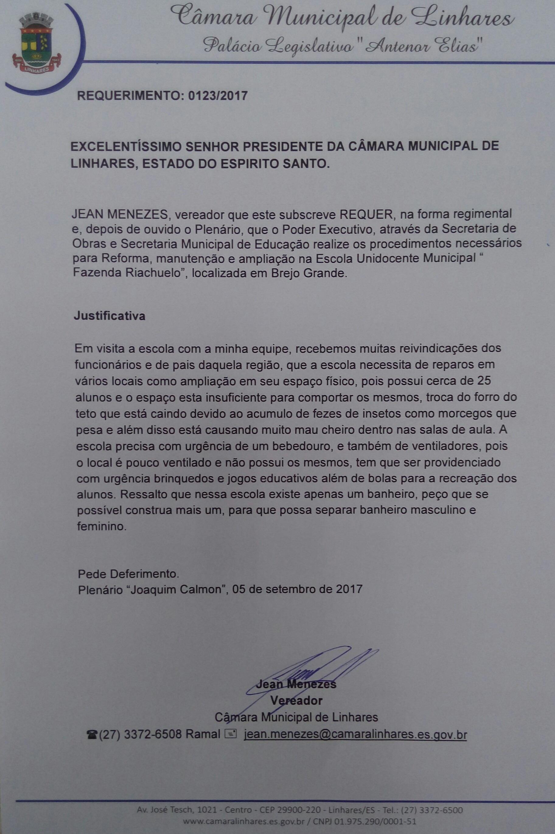 Última Ação: ENCAMINHO CÓPIA DO OFÍCIO N° 0433/2017, RECEBIDO NA PREFEITURA MUNICIPAL DE LINHARES NO DIA 29/06/2017.