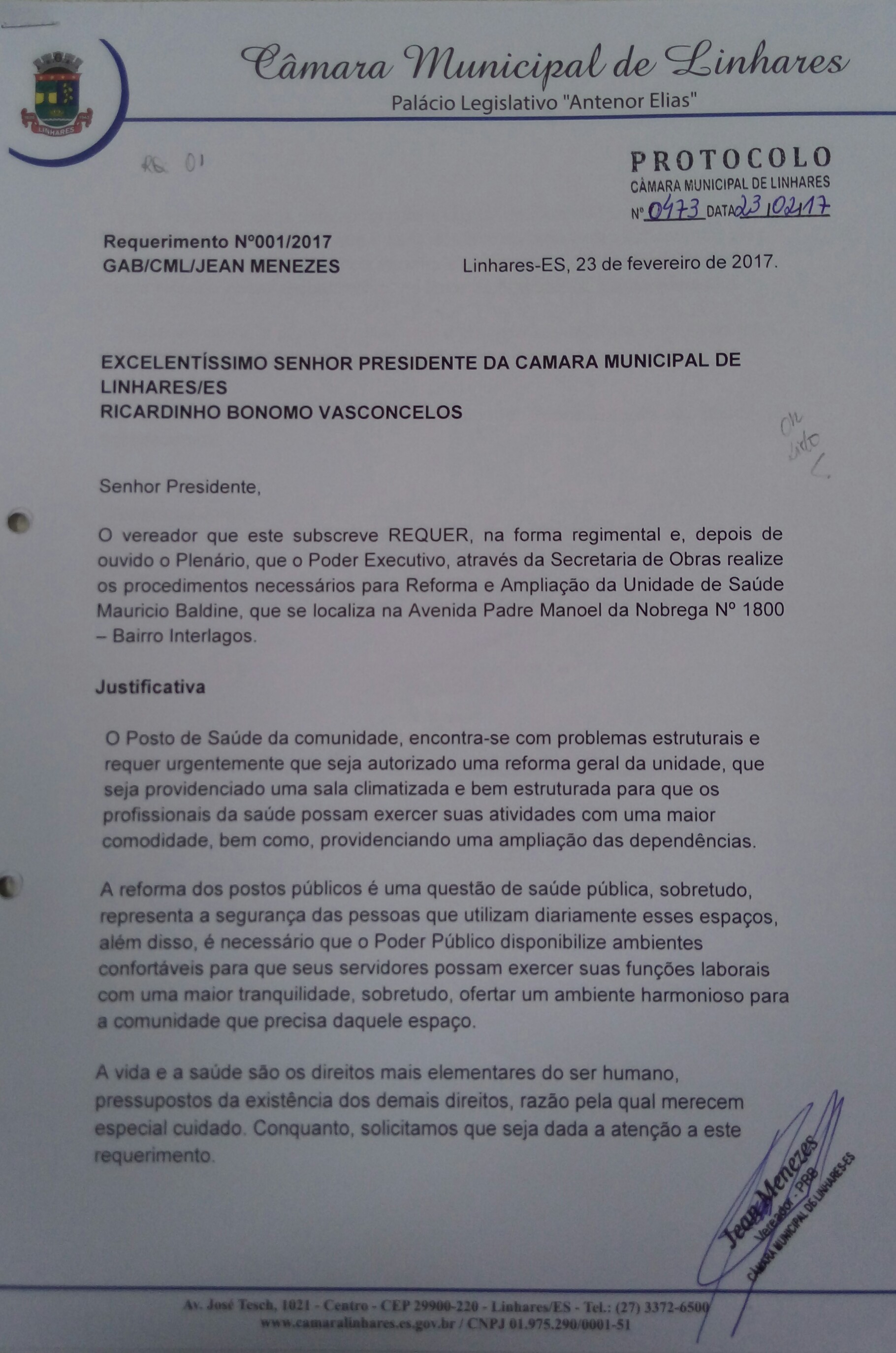 Ementa: O VEREADOR QUE ESTE SUBSCREVE REQUER, NA FORMA REGIMENTAL E, DEPOIS DE OUVIDO O PLENÁRIO, QUE O PODER EXECUTIVO, ATRAVÉS DA SECRETARIA DE OBRAS REALIZE OS PROCEDIMENTOS NECESSÁRIOS PARA REFORMA E AMPLIAÇÃO DA UNIDADE DE SAÚDE MAURICIO BALDINE, QUE SE LOCALIZA NA AVENIDA PADRE MANOEL DA NOBREGA Nº 1800 – BAIRRO INTERLAGOS.