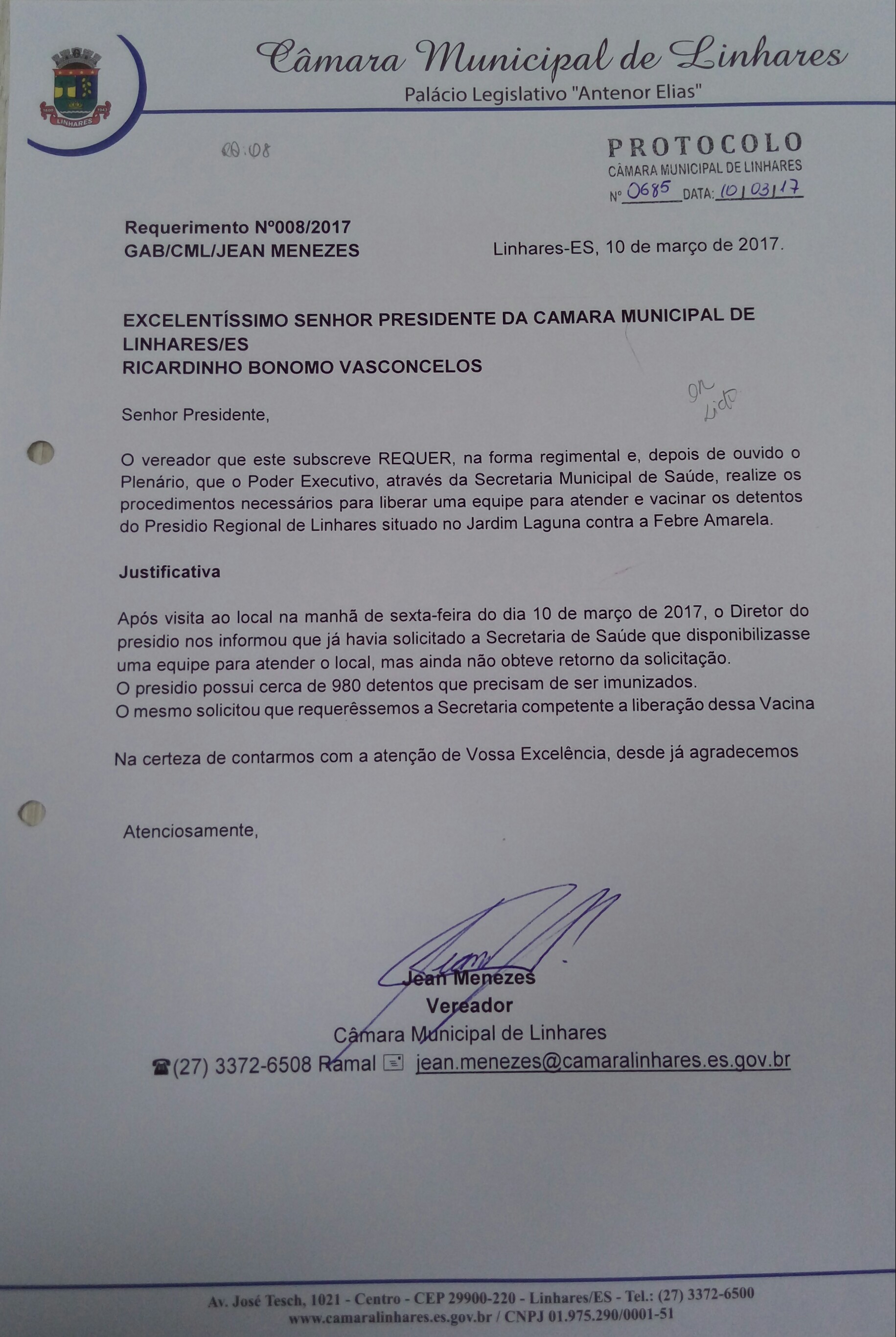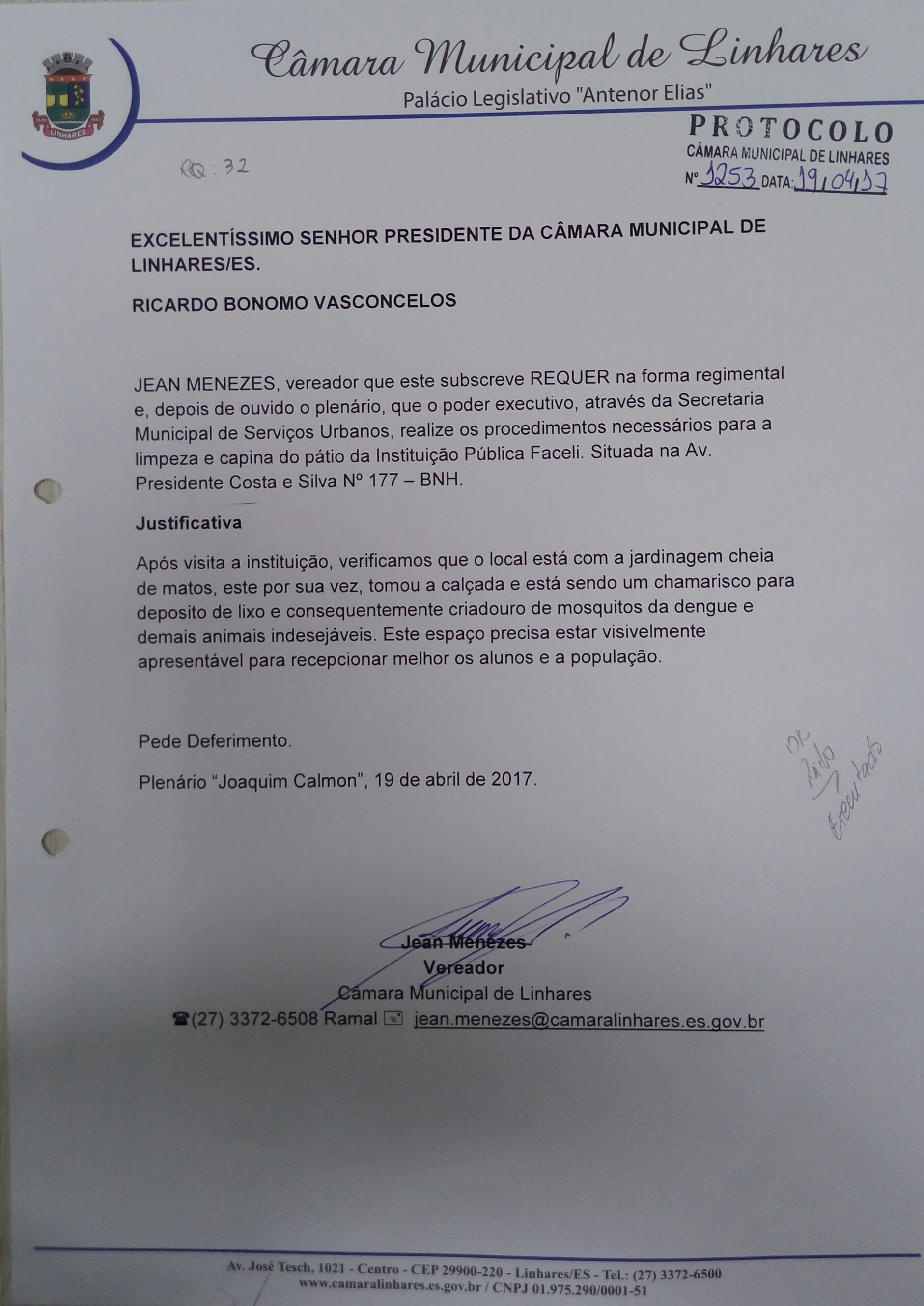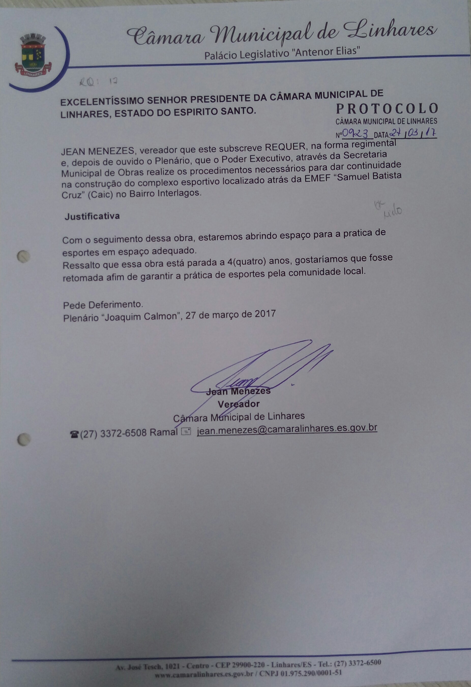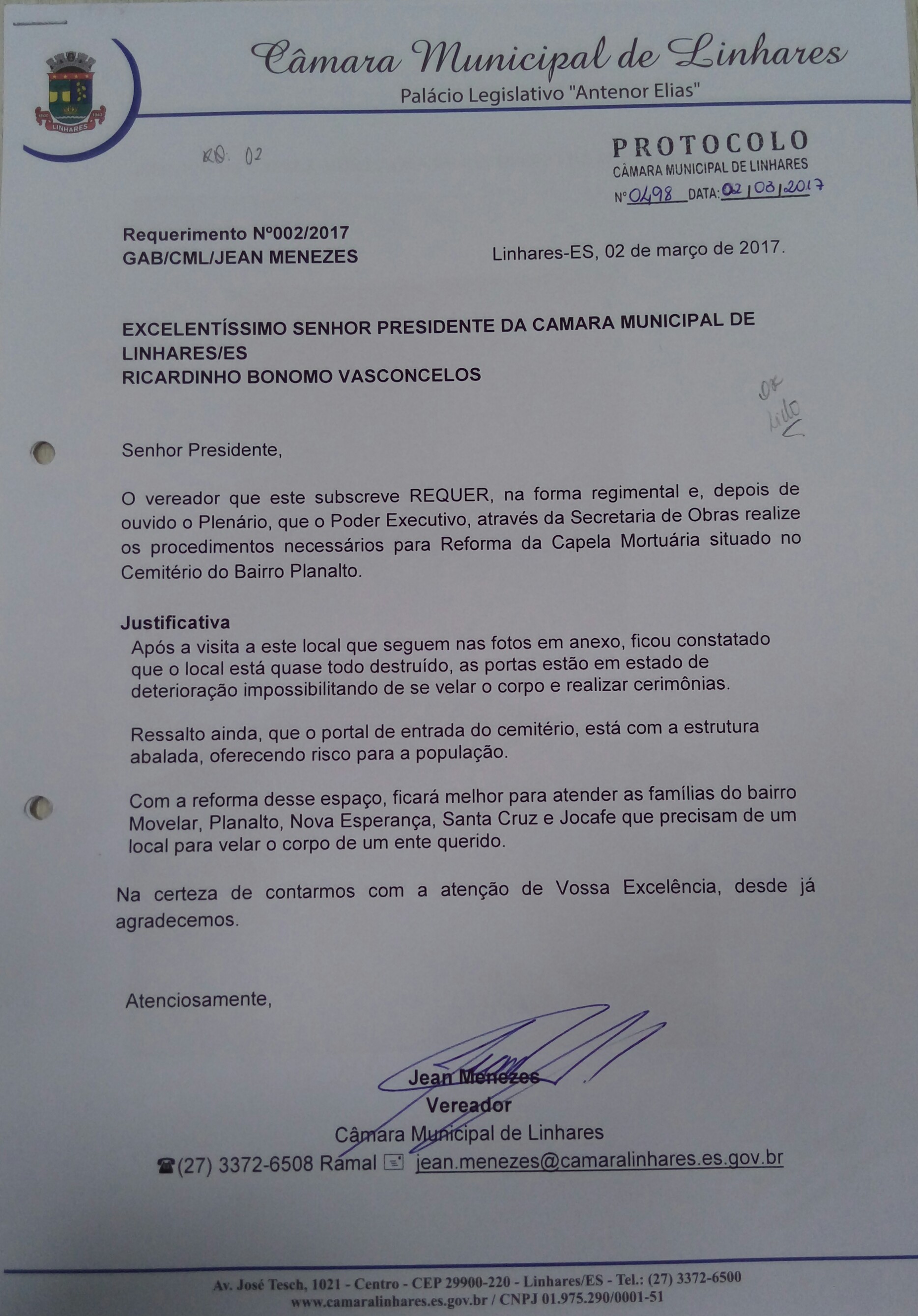 Última Ação: Encaminho cópia do ofício n°101/2017, protocolizado na Prefeitura Municipal de Linhares sob o n°004854/2017, no dia 23/03/2017.