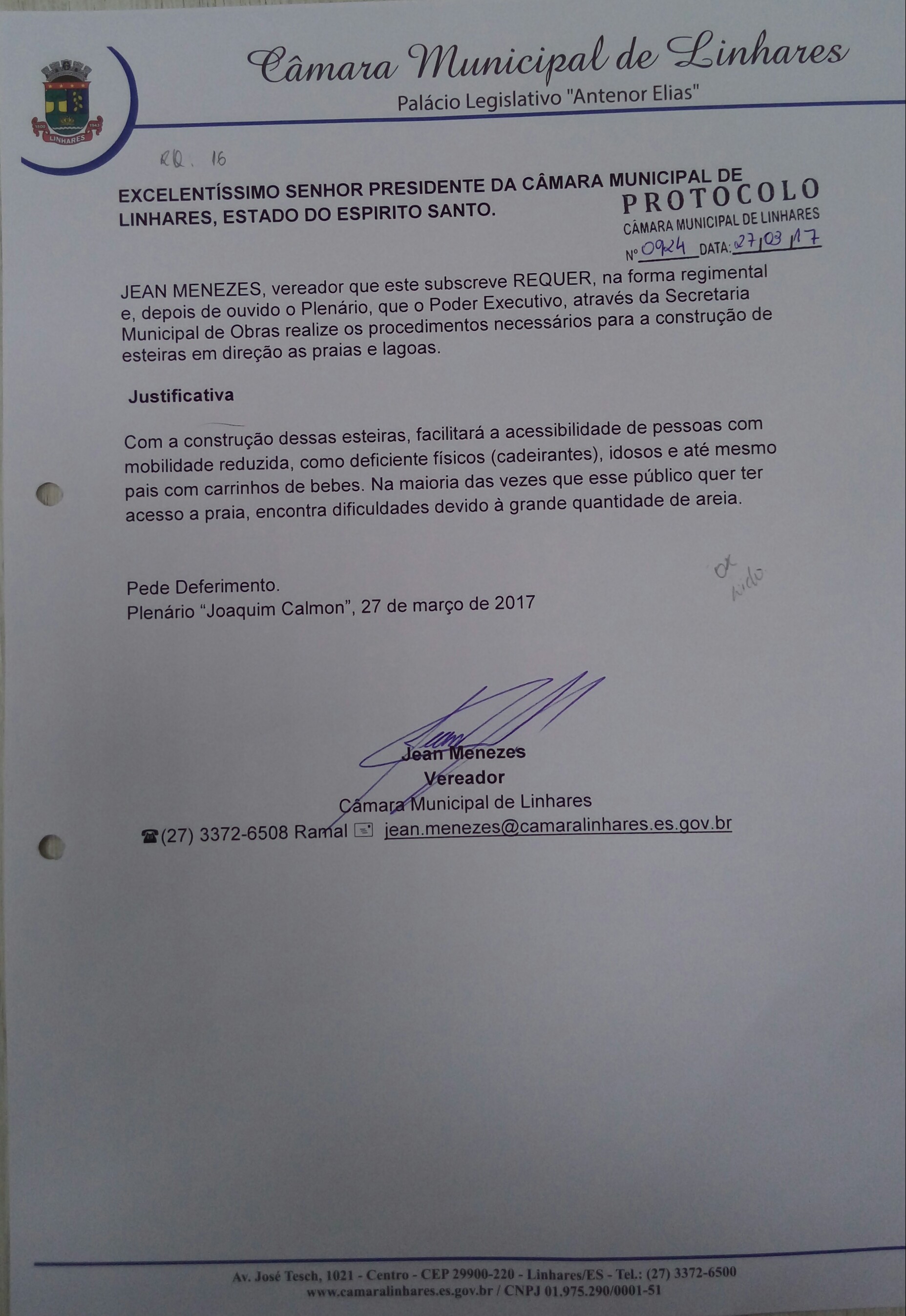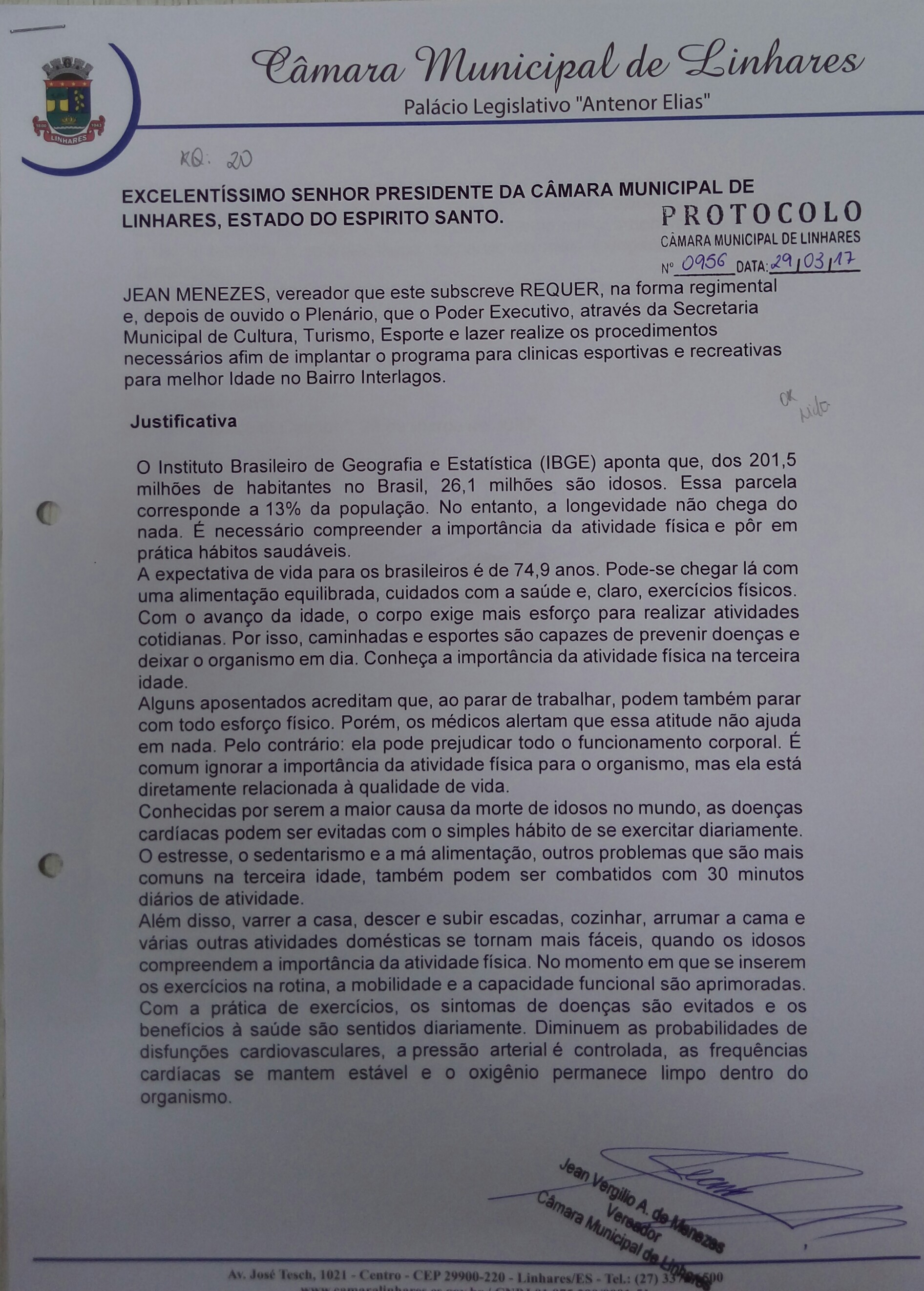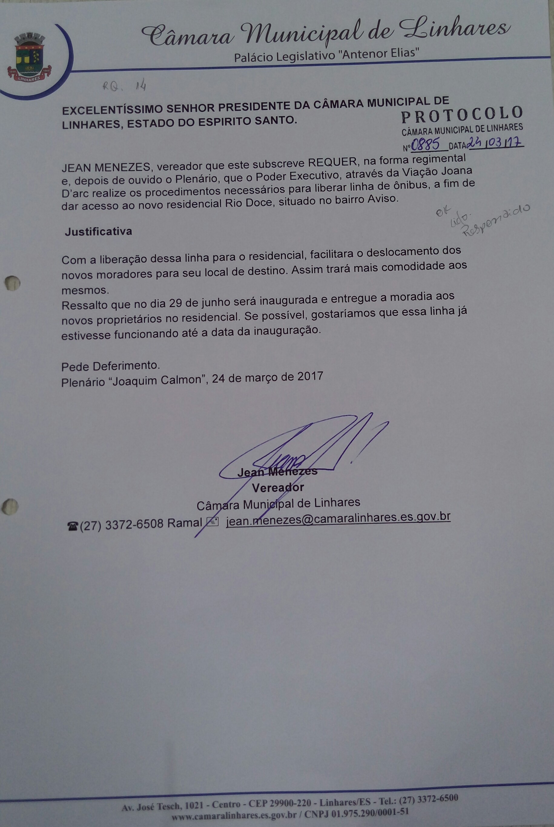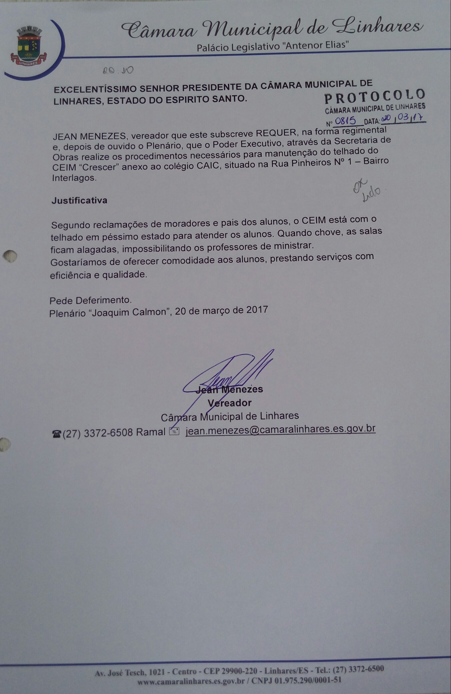 Última Ação: Encaminho cópia do ofício n°101/2017, protocolizado na Prefeitura Municipal de Linhares sob o n°004854/2017, no dia 23/03/2017.