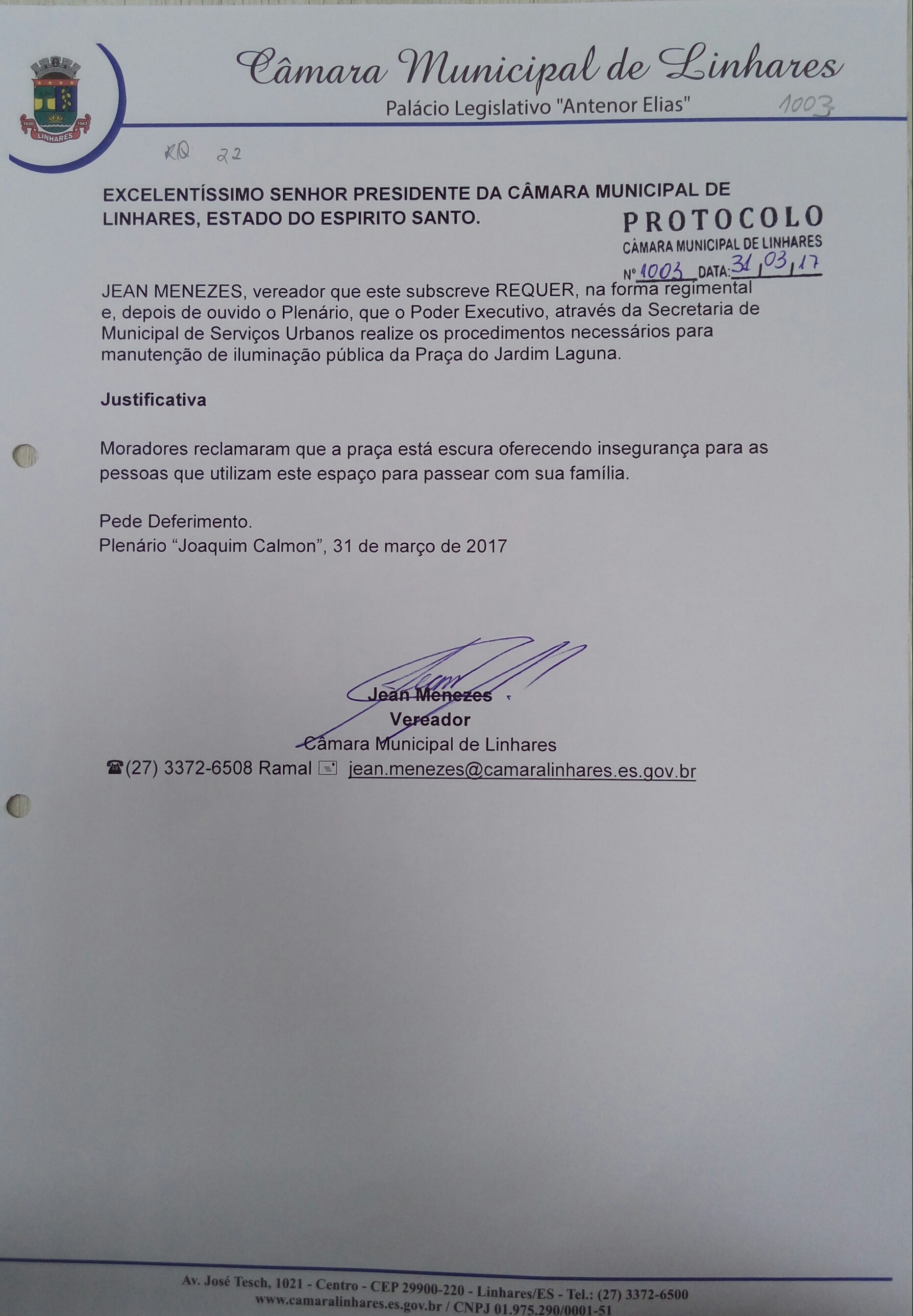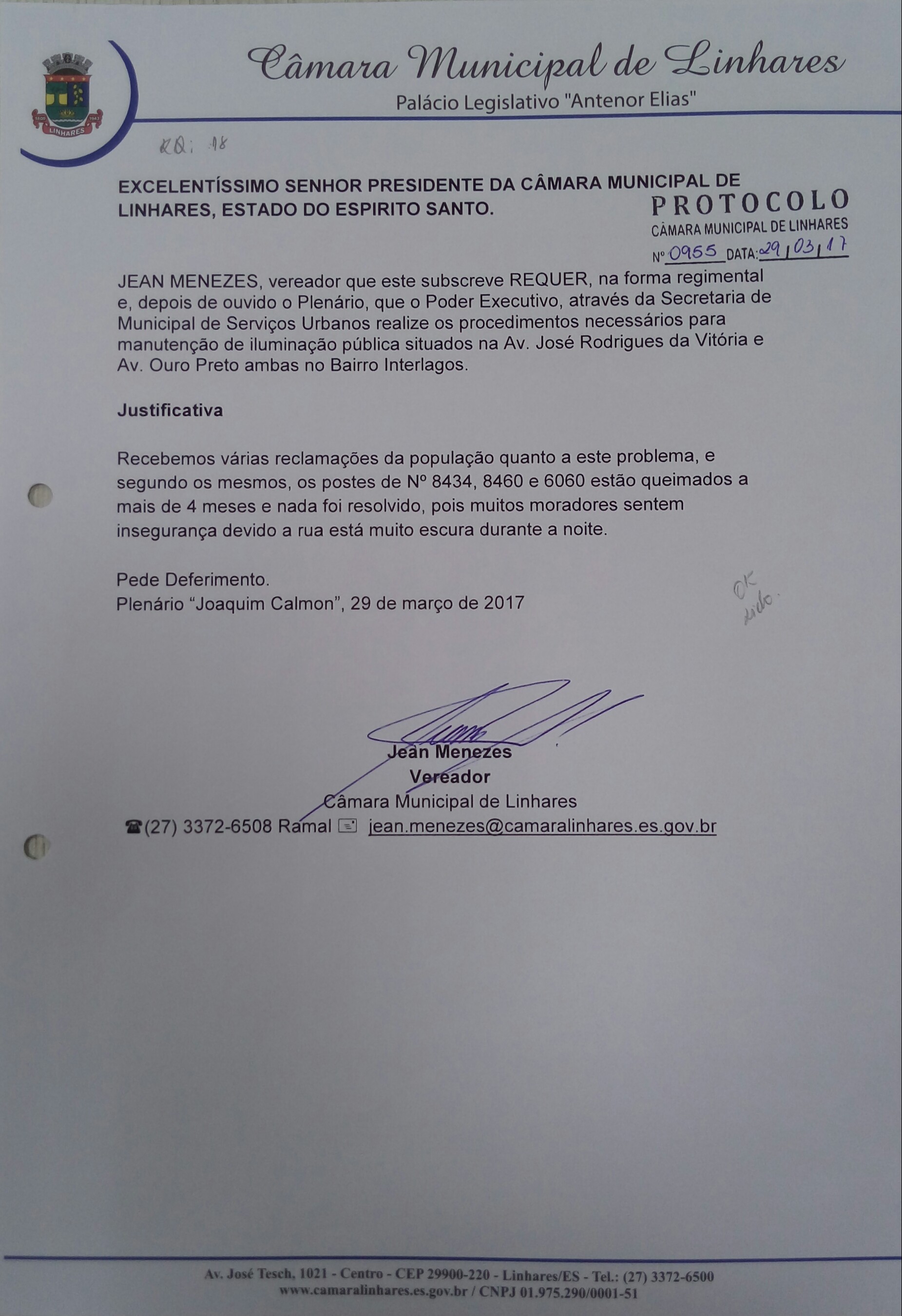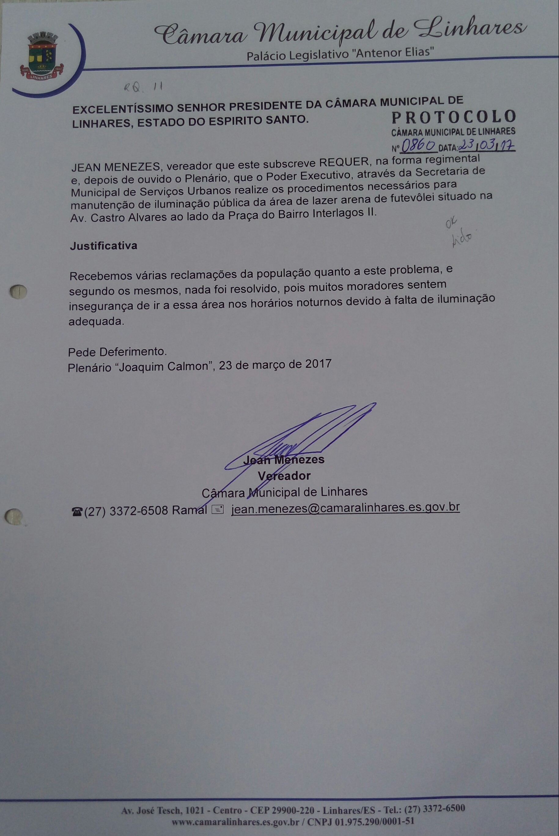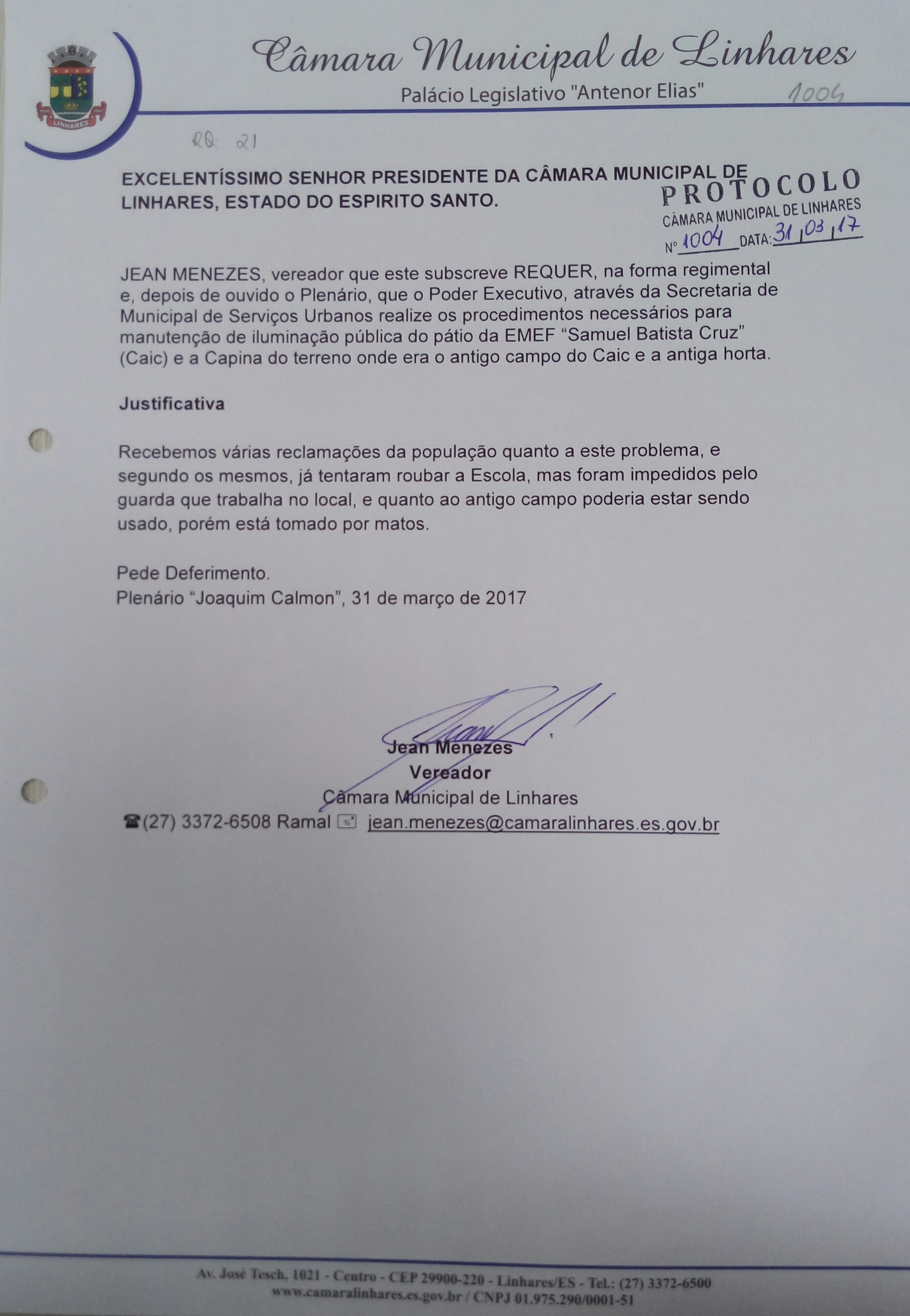 Última Ação: Encaminho cópia do ofício n°101/2017, protocolizado na Prefeitura Municipal de Linhares sob o n°004854/2017, no dia 23/03/2017.