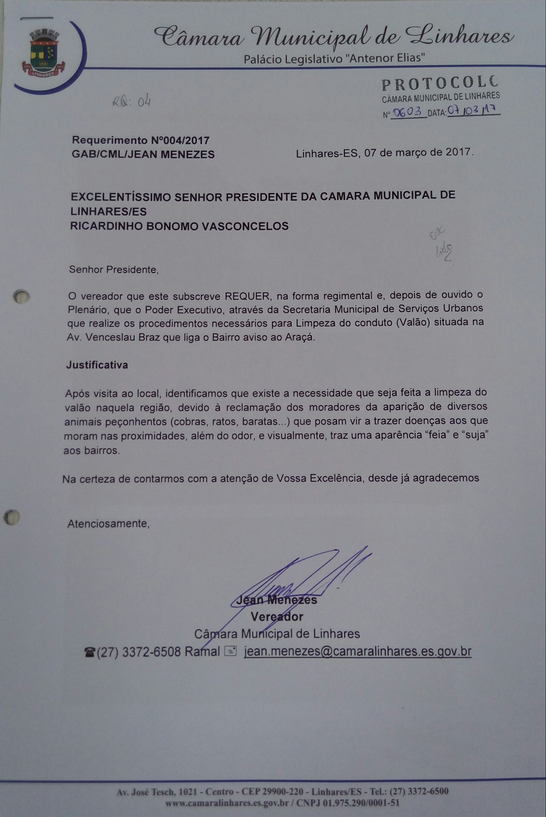 Ementa: O VEREADOR QUE ESTE SUBSCREVE REQUER, NA FORMA REGIMENTAL E, DEPOIS DE OUVIDO O PLENÁRIO, QUE O PODER EXECUTIVO, ATRAVÉS DA SECRETARIA MUNICIPAL DE SERVIÇOS URBANOS QUE REALIZE OS PROCEDIMENTOS NECESSÁRIOS PARA LIMPEZA DO CONDUTO (VALÃO) SITUADA NA AV. VENCESLAU BRAZ QUE LIGA O BAIRRO AVISO AO ARAÇÁ.