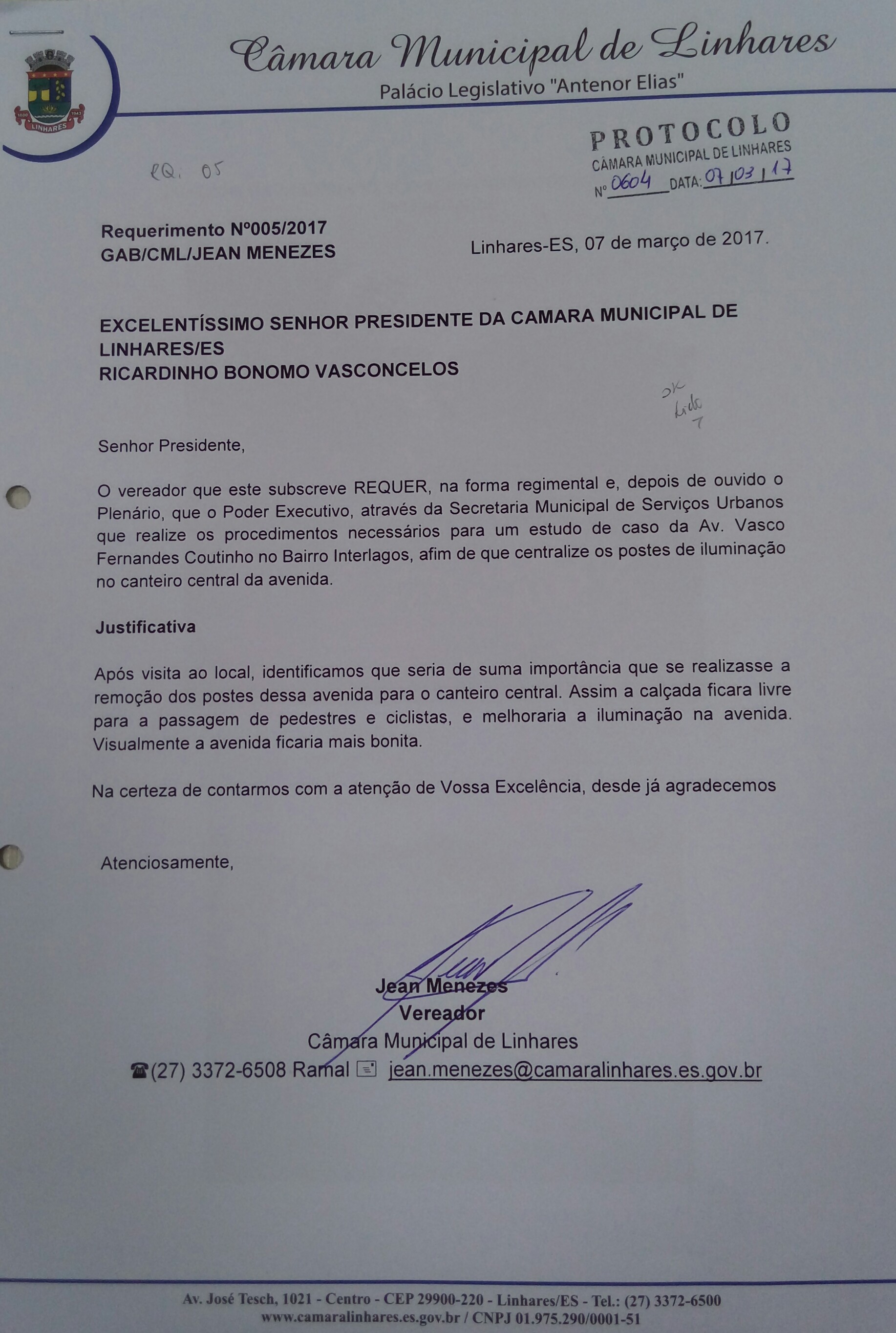 Ementa: O VEREADOR QUE ESTE SUBSCREVE REQUER, NA FORMA REGIMENTAL E, DEPOIS DE OUVIDO O PLENÁRIO, QUE O PODER EXECUTIVO, ATRAVÉS DA SECRETARIA MUNICIPAL DE SERVIÇOS URBANOS QUE REALIZE OS PROCEDIMENTOS NECESSÁRIOS PARA UM ESTUDO DE CASO DA AV. VASCO FERNANDES COUTINHO NO BAIRRO INTERLAGOS, AFIM DE QUE CENTRALIZE OS POSTES DE ILUMINAÇÃO NO CANTEIRO CENTRAL DA AVENIDA.