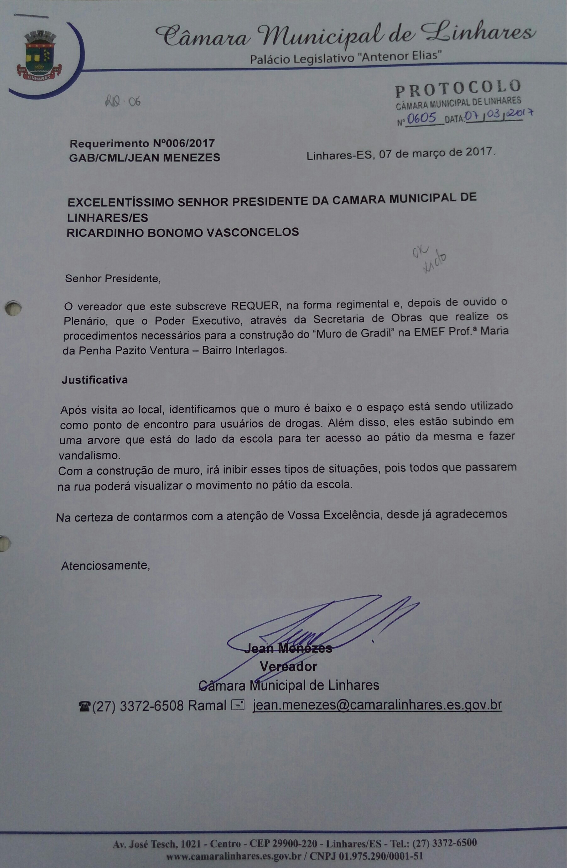 Ementa: O VEREADOR QUE ESTE SUBSCREVE REQUER, NA FORMA REGIMENTAL E, DEPOIS DE OUVIDO O PLENÁRIO, QUE O PODER EXECUTIVO, ATRAVÉS DA SECRETARIA DE OBRAS QUE REALIZE OS PROCEDIMENTOS NECESSÁRIOS PARA A CONSTRUÇÃO DO “MURO DE GRADIL” NA EMEF PROF.ª MARIA DA PENHA PAZITO VENTURA – BAIRRO INTERLAGOS.