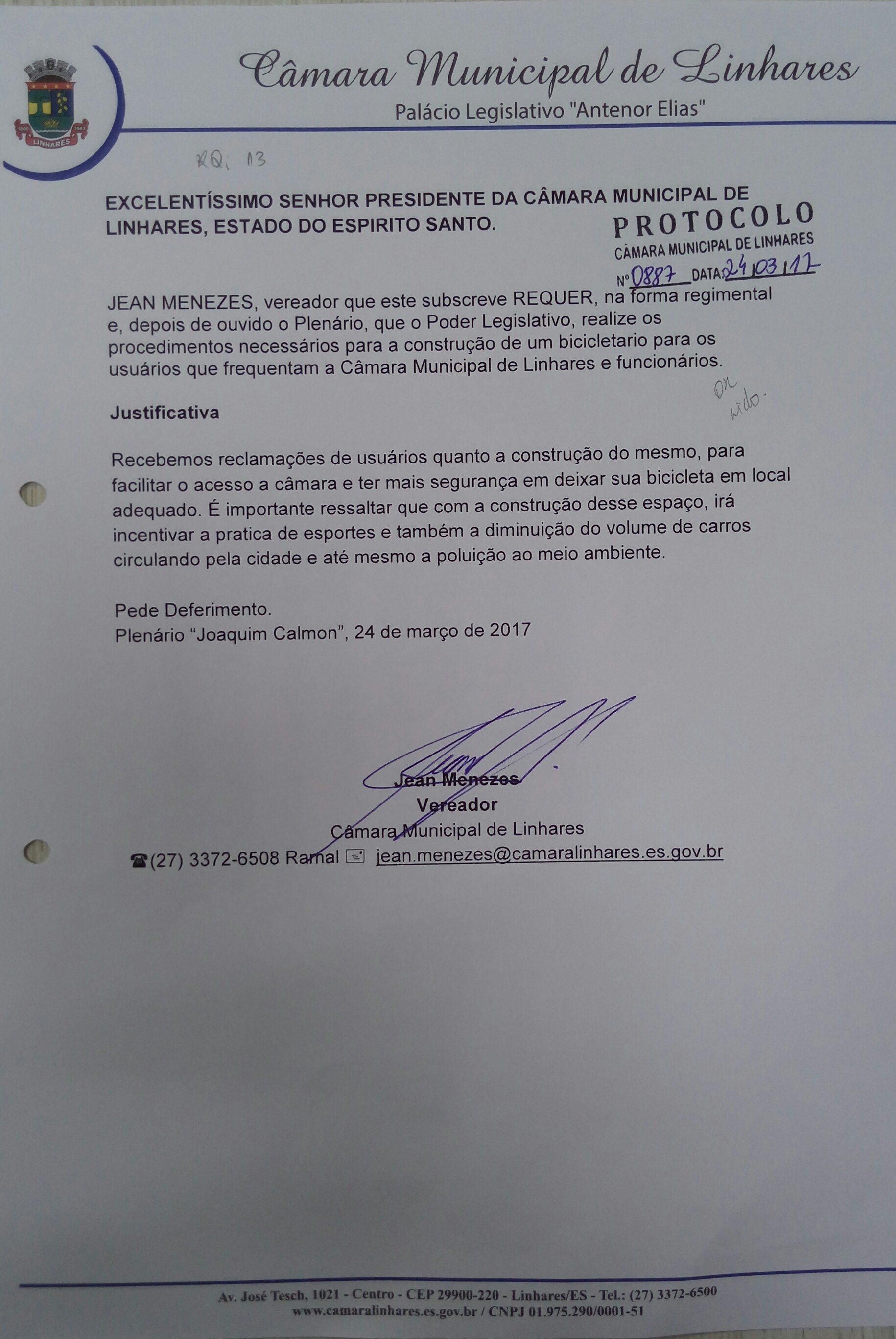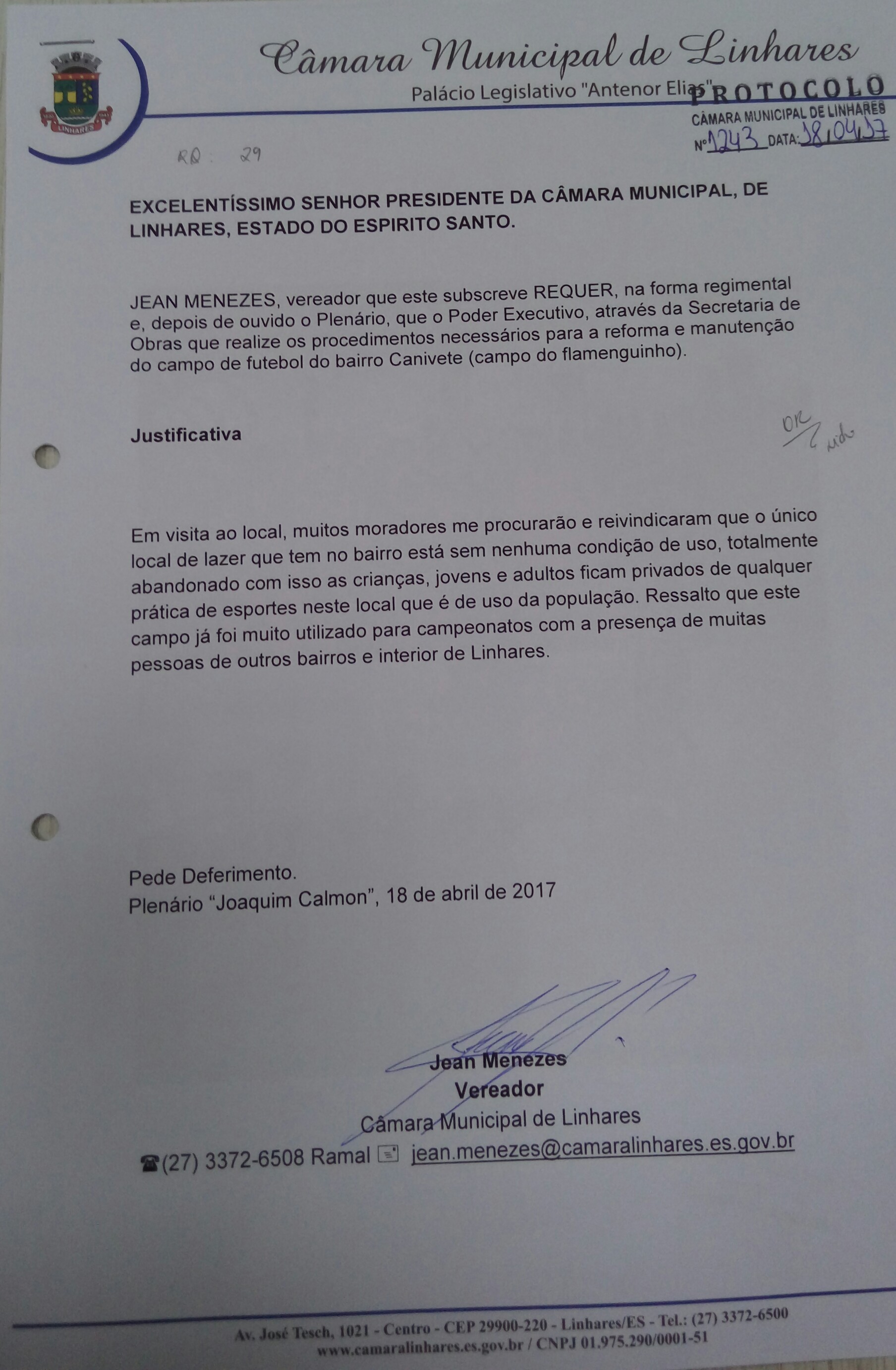Última Ação: Encaminho cópia do ofício n°165/2017, protocolizado na Prefeitura Municipal de Linhares sob o n°005811/2017, no dia 06/04/2017.