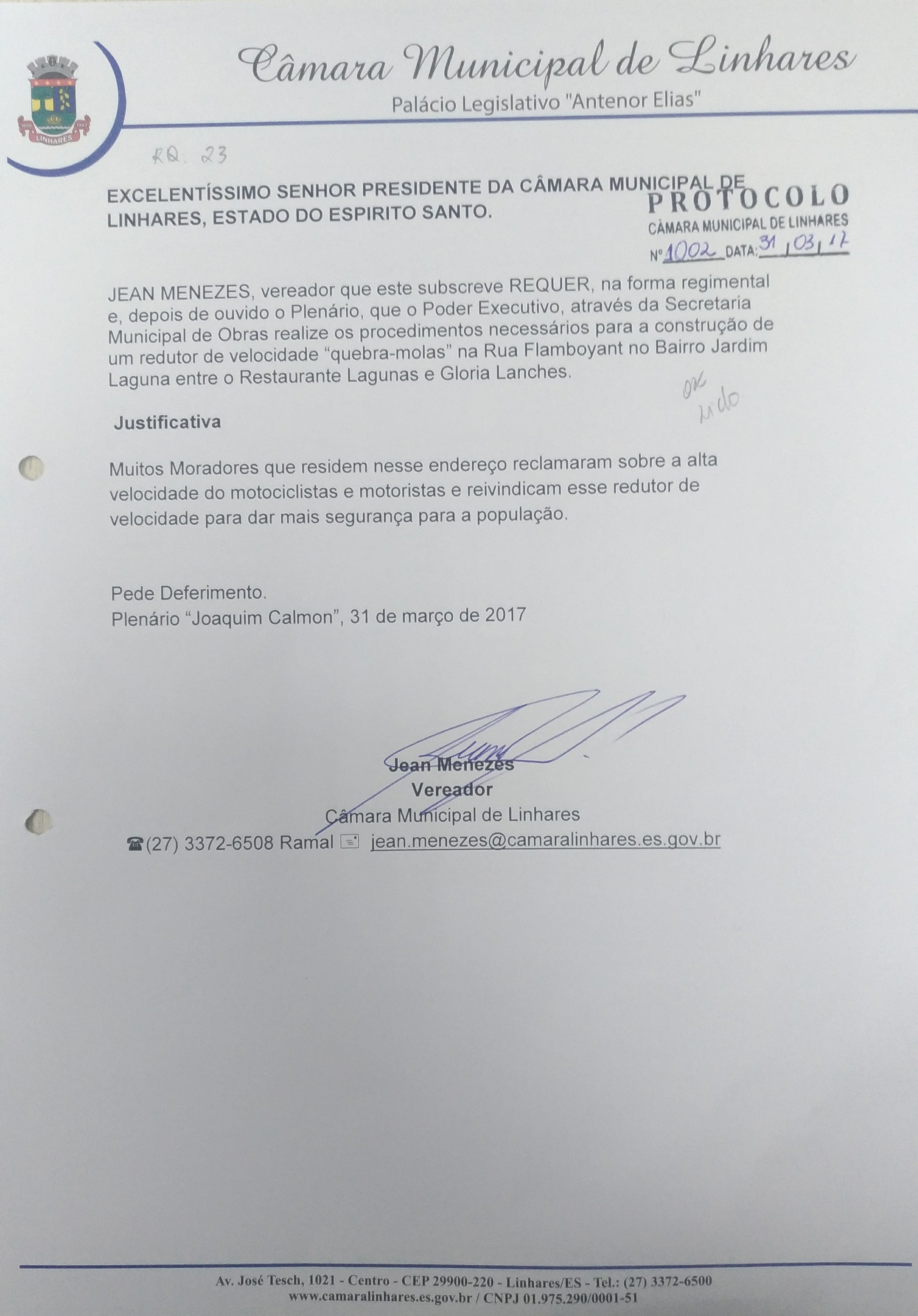 Ementa: JEAN MENEZES, VEREADOR QUE ESTE SUBSCREVE REQUER, NA FORMA REGIMENTAL E, DEPOIS DE OUVIDO O PLENÁRIO, QUE O PODER EXECUTIVO, ATRAVÉS DA SECRETARIA MUNICIPAL DE OBRAS REALIZE OS PROCEDIMENTOS NECESSÁRIOS PARA A CONSTRUÇÃO DE UM REDUTOR DE VELOCIDADE “QUEBRA-MOLAS” NA RUA FLAMBOYANT NO BAIRRO JARDIM LAGUNA ENTRE O RESTAURANTE LAGUNAS E GLORIA LANCHES.