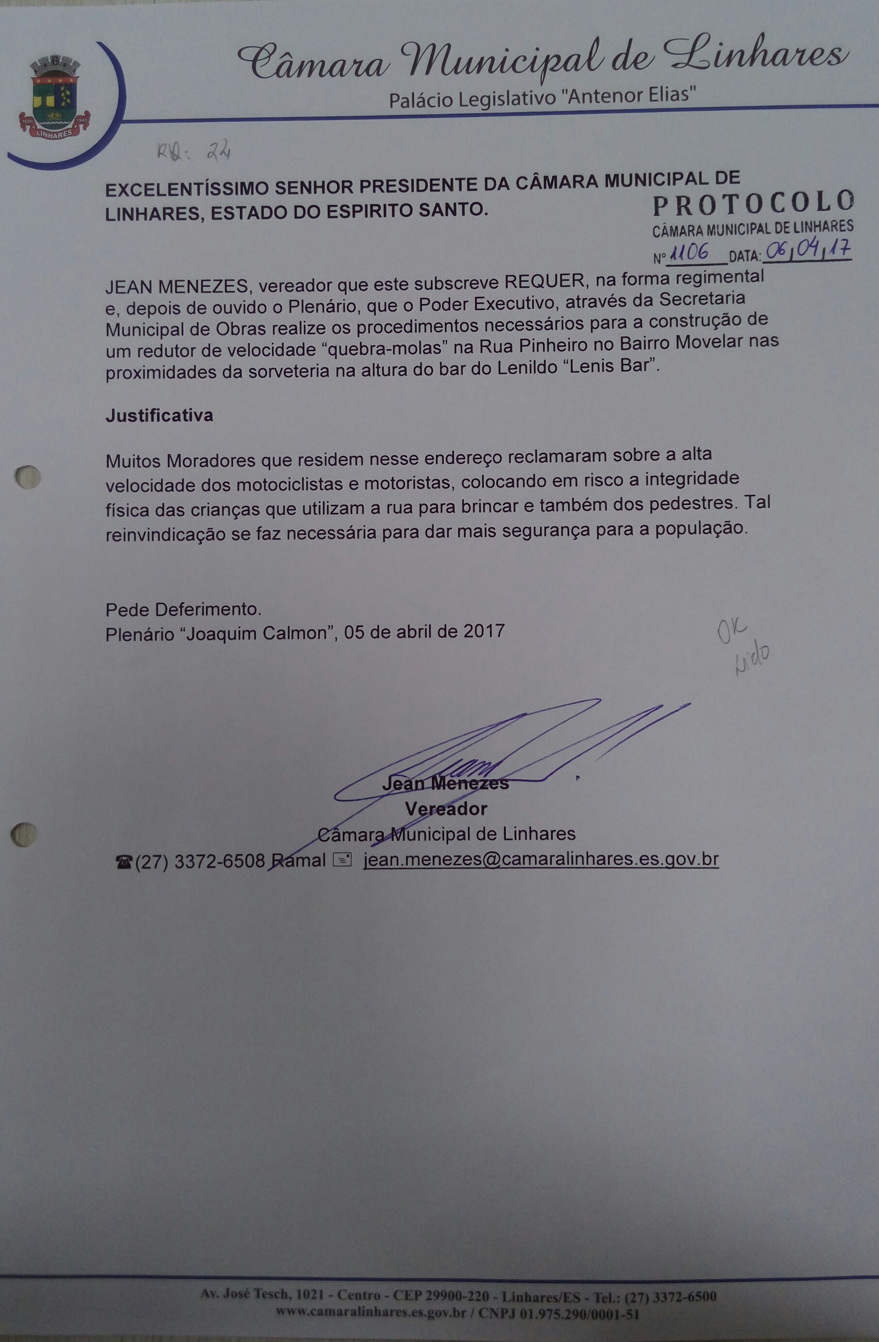 Ementa: JEAN MENEZES, VEREADOR QUE ESTE SUBSCREVE REQUER, NA FORMA REGIMENTAL E, DEPOIS DE OUVIDO O PLENÁRIO, QUE O PODER EXECUTIVO, ATRAVÉS DA SECRETARIA MUNICIPAL DE OBRAS REALIZE OS PROCEDIMENTOS NECESSÁRIOS PARA A CONSTRUÇÃO DE UM REDUTOR DE VELOCIDADE “QUEBRA-MOLAS” NA RUA PINHEIRO NO BAIRRO MOVELAR NAS PROXIMIDADES DA SORVETERIA NA ALTURA DO BAR DO LENILDO “LENIS BAR”.