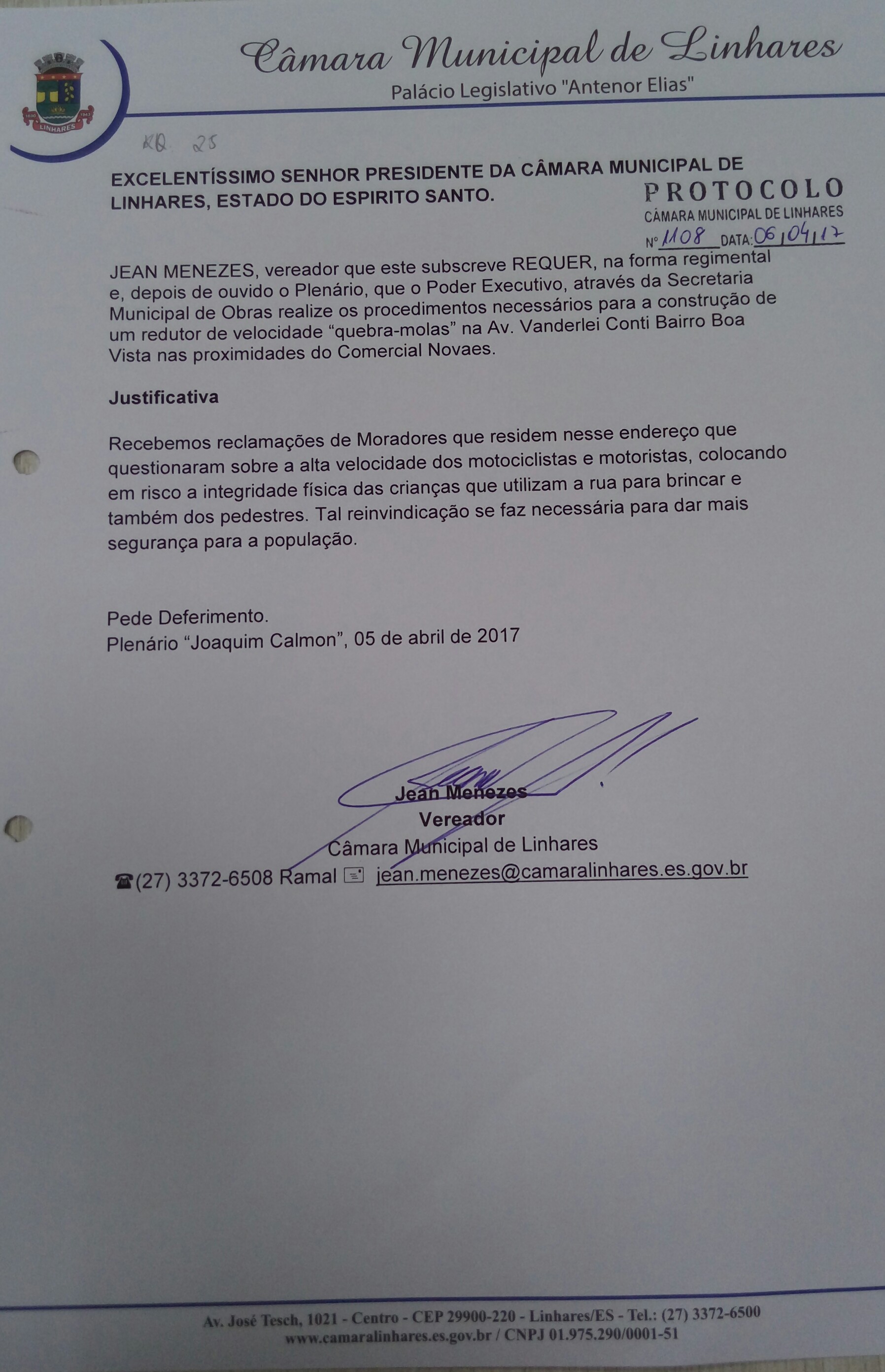 Ementa: JEAN MENEZES, VEREADOR QUE ESTE SUBSCREVE REQUER, NA FORMA REGIMENTAL E, DEPOIS DE OUVIDO O PLENÁRIO, QUE O PODER EXECUTIVO, ATRAVÉS DA SECRETARIA MUNICIPAL DE OBRAS REALIZE OS PROCEDIMENTOS NECESSÁRIOS PARA A CONSTRUÇÃO DE UM REDUTOR DE VELOCIDADE “QUEBRA-MOLAS” NA AV. VANDERLEI CONTI BAIRRO BOA VISTA NAS PROXIMIDADES DO COMERCIAL NOVAES.