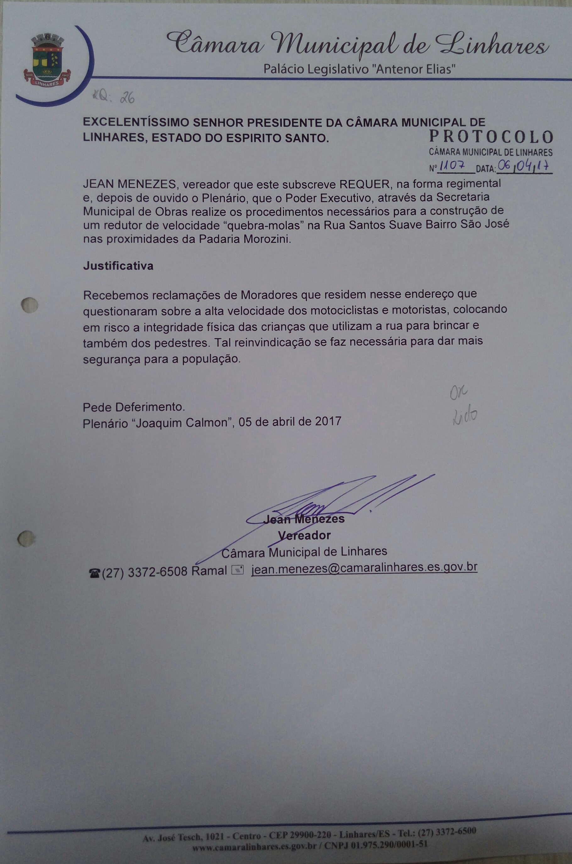 Ementa: JEAN MENEZES, VEREADOR QUE ESTE SUBSCREVE REQUER, NA FORMA REGIMENTAL E, DEPOIS DE OUVIDO O PLENÁRIO, QUE O PODER EXECUTIVO, ATRAVÉS DA SECRETARIA MUNICIPAL DE OBRAS REALIZE OS PROCEDIMENTOS NECESSÁRIOS PARA A CONSTRUÇÃO DE UM REDUTOR DE VELOCIDADE “QUEBRA-MOLAS” NA RUA SANTOS SUAVE BAIRRO SÃO JOSÉ NAS PROXIMIDADES DA PADARIA MOROZINI.