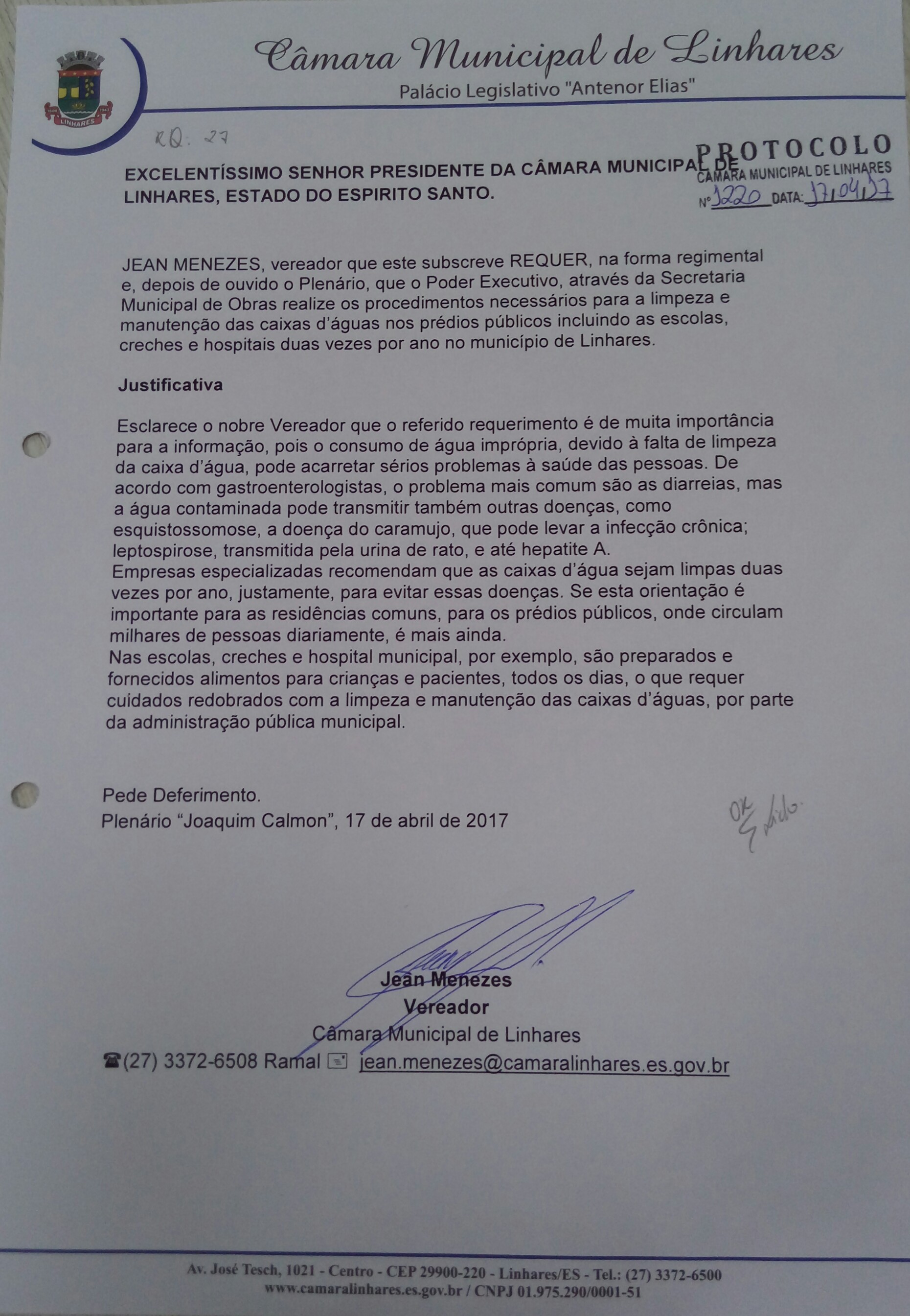 Ementa: JEAN MENEZES, VEREADOR QUE ESTE SUBSCREVE REQUER, NA FORMA REGIMENTAL E, DEPOIS DE OUVIDO O PLENÁRIO, QUE O PODER EXECUTIVO, ATRAVÉS DA SECRETARIA MUNICIPAL DE OBRAS REALIZE OS PROCEDIMENTOS NECESSÁRIOS PARA A LIMPEZA E MANUTENÇÃO DAS CAIXAS D’ÁGUAS NOS PRÉDIOS PÚBLICOS INCLUINDO AS ESCOLAS, CRECHES E HOSPITAIS DUAS VEZES POR ANO NO MUNICÍPIO DE LINHARES.