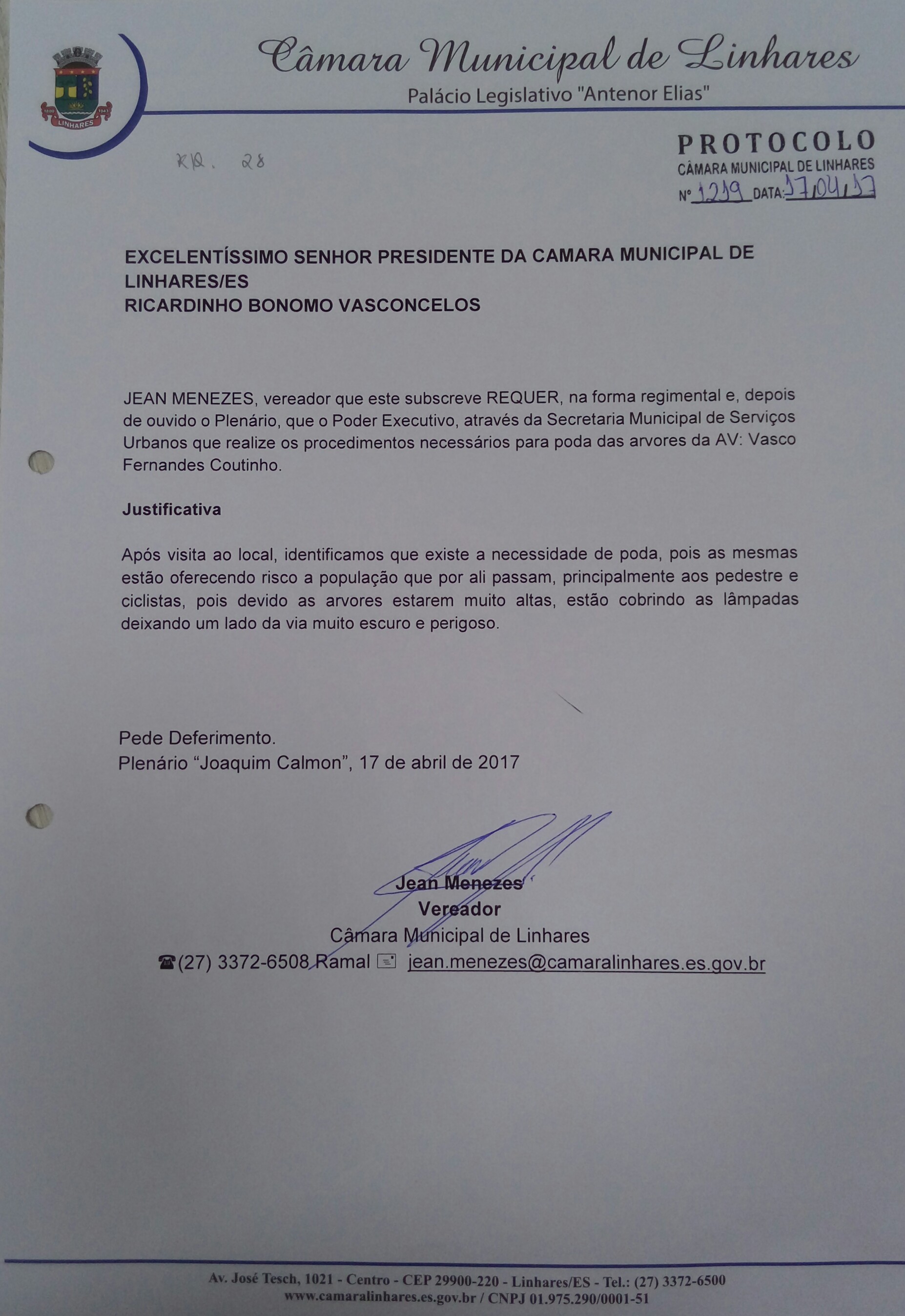 Ementa: JEAN MENEZES, VEREADOR QUE ESTE SUBSCREVE REQUER, NA FORMA REGIMENTAL E, DEPOIS DE OUVIDO O PLENÁRIO, QUE O PODER EXECUTIVO, ATRAVÉS DA SECRETARIA MUNICIPAL DE SERVIÇOS URBANOS QUE REALIZE OS PROCEDIMENTOS NECESSÁRIOS PARA PODA DAS ARVORES DA AV: VASCO FERNANDES COUTINHO.