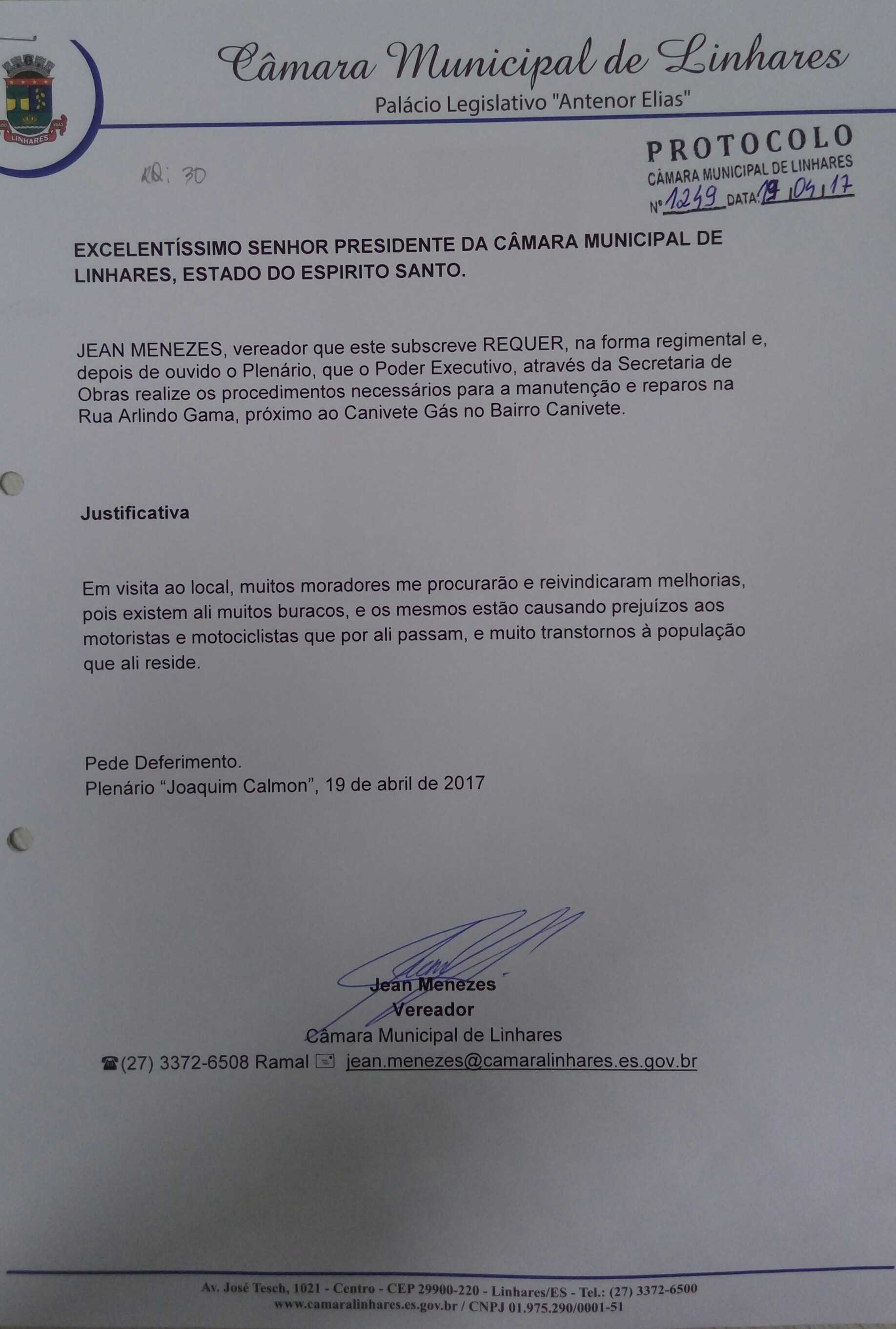 Ementa: JEAN MENEZES, VEREADOR QUE ESTE SUBSCREVE REQUER, NA FORMA REGIMENTAL E, DEPOIS DE OUVIDO O PLENÁRIO, QUE O PODER EXECUTIVO, ATRAVÉS DA SECRETARIA DE OBRAS REALIZE OS PROCEDIMENTOS NECESSÁRIOS PARA A MANUTENÇÃO E REPAROS NA RUA ARLINDO GAMA, PRÓXIMO AO CANIVETE GÁS NO BAIRRO CANIVETE.