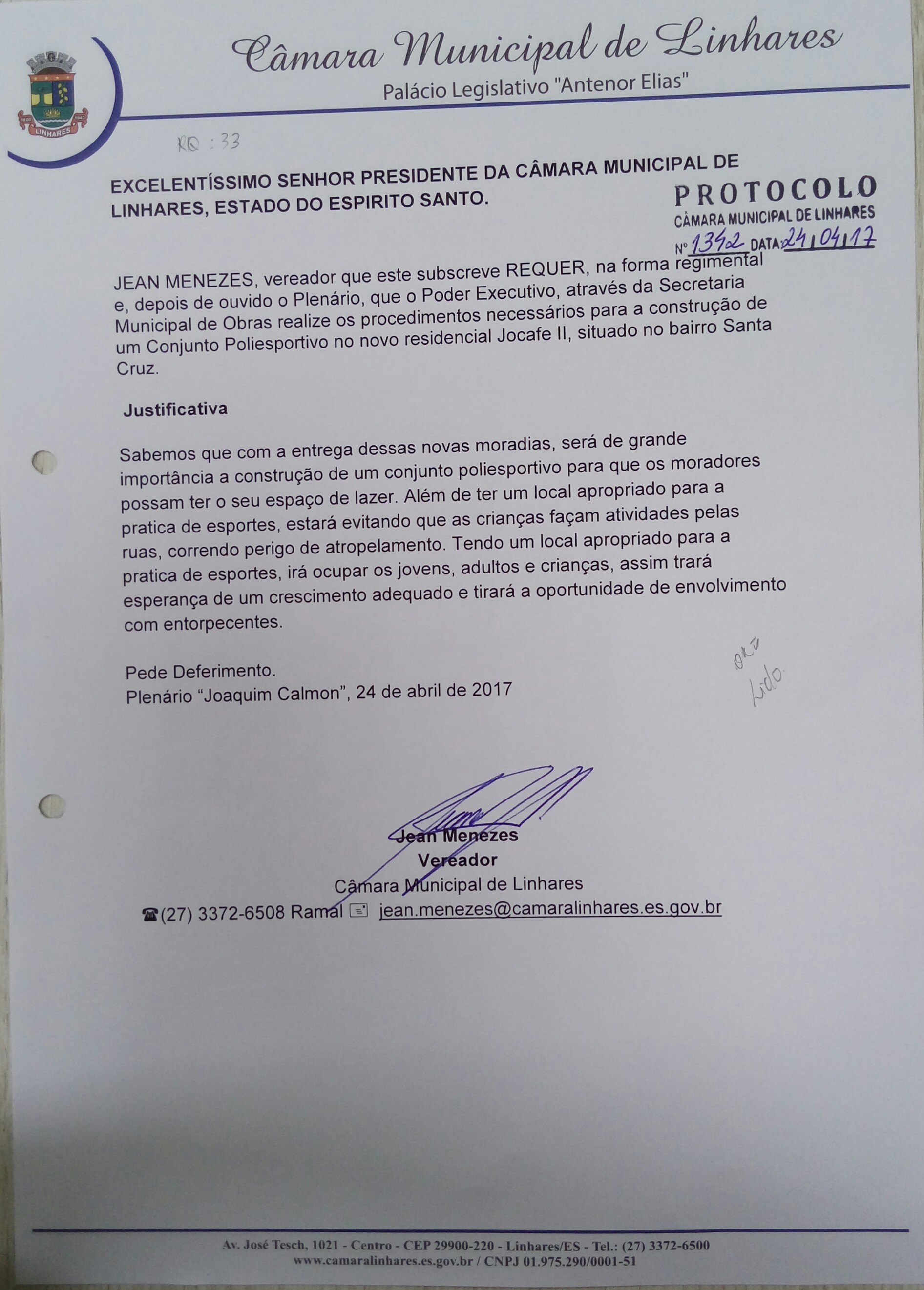 Ementa: JEAN MENEZES, VEREADOR QUE ESTE SUBSCREVE REQUER, NA FORMA REGIMENTAL E, DEPOIS DE OUVIDO O PLENÁRIO, QUE O PODER EXECUTIVO, ATRAVÉS DA SECRETARIA MUNICIPAL DE OBRAS REALIZE OS PROCEDIMENTOS NECESSÁRIOS PARA A CONSTRUÇÃO DE UM CONJUNTO POLIESPORTIVO NO NOVO RESIDENCIAL JOCAFE II, SITUADO NO BAIRRO SANTA CRUZ.
