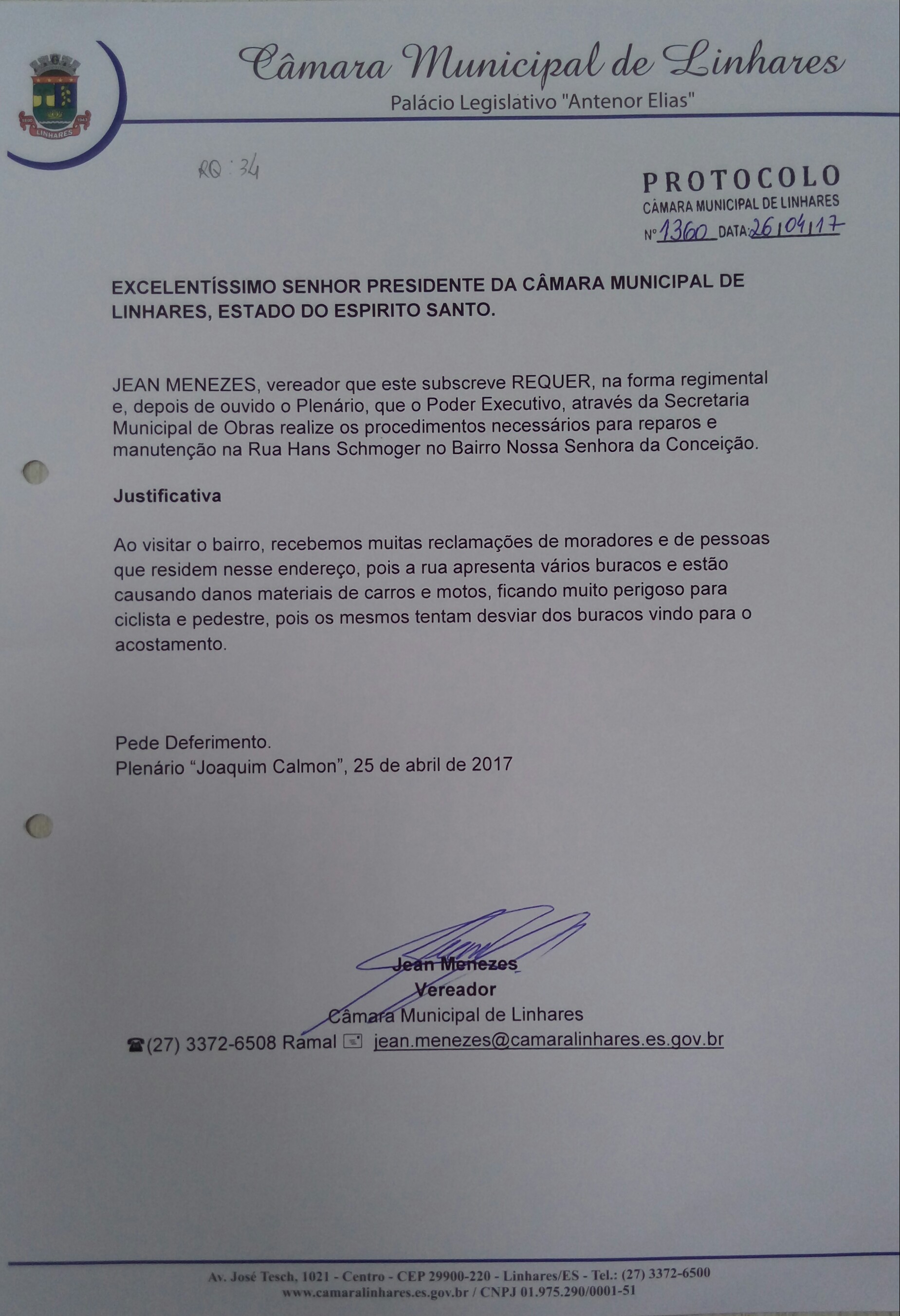 Ementa: JEAN MENEZES, VEREADOR QUE ESTE SUBSCREVE REQUER, NA FORMA REGIMENTAL E, DEPOIS DE OUVIDO O PLENÁRIO, QUE O PODER EXECUTIVO, ATRAVÉS DA SECRETARIA MUNICIPAL DE OBRAS REALIZE OS PROCEDIMENTOS NECESSÁRIOS PARA REPAROS E MANUTENÇÃO NA RUA HANS SCHMOGER NO BAIRRO NOSSA SENHORA DA CONCEIÇÃO.