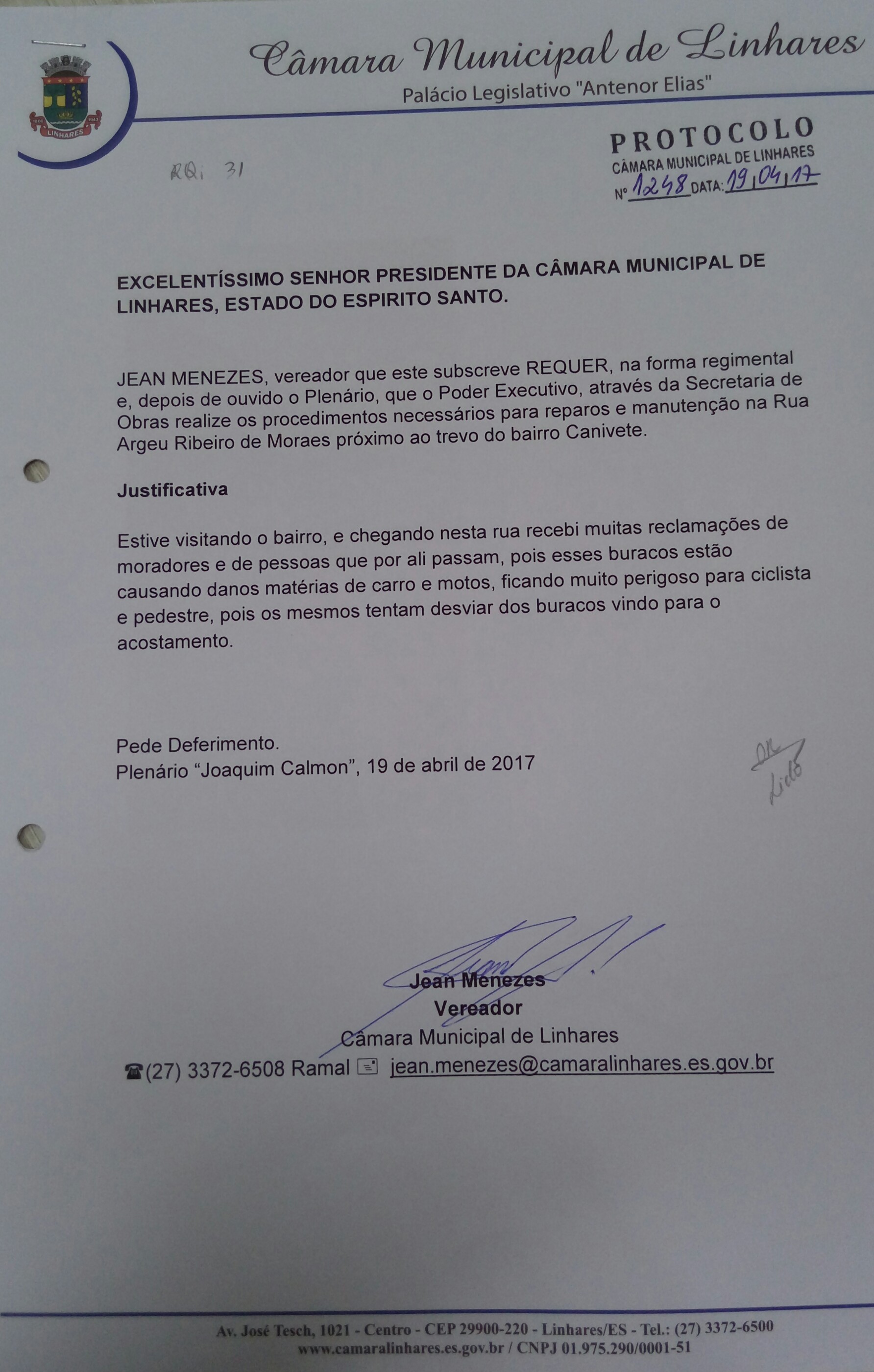 Ementa: JEAN MENEZES, VEREADOR QUE ESTE SUBSCREVE REQUER, NA FORMA REGIMENTAL E, DEPOIS DE OUVIDO O PLENÁRIO, QUE O PODER EXECUTIVO, ATRAVÉS DA SECRETARIA DE OBRAS REALIZE OS PROCEDIMENTOS NECESSÁRIOS PARA REPAROS E MANUTENÇÃO NA RUA ARGEU RIBEIRO DE MORAES PRÓXIMO AO TREVO DO BAIRRO CANIVETE.