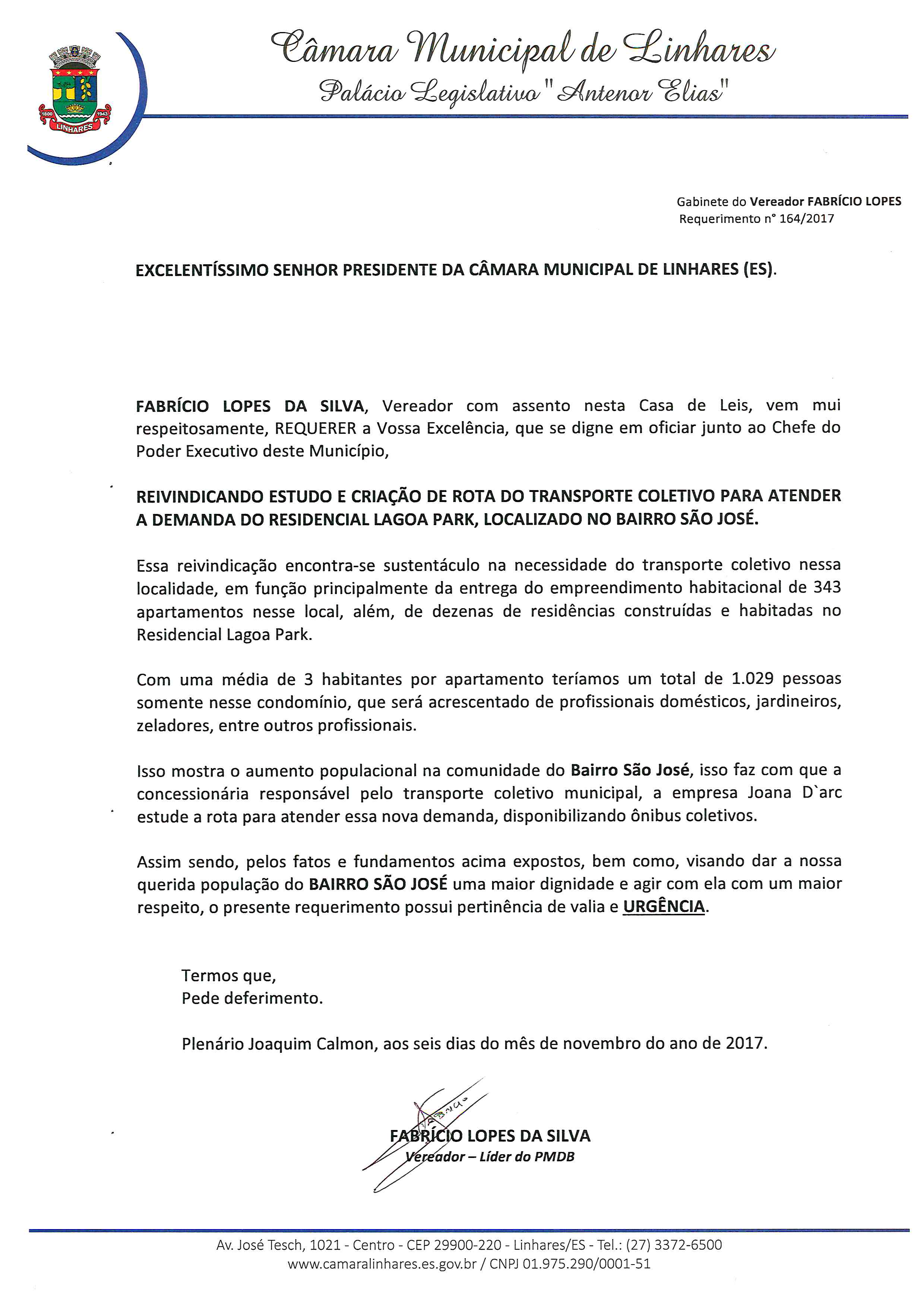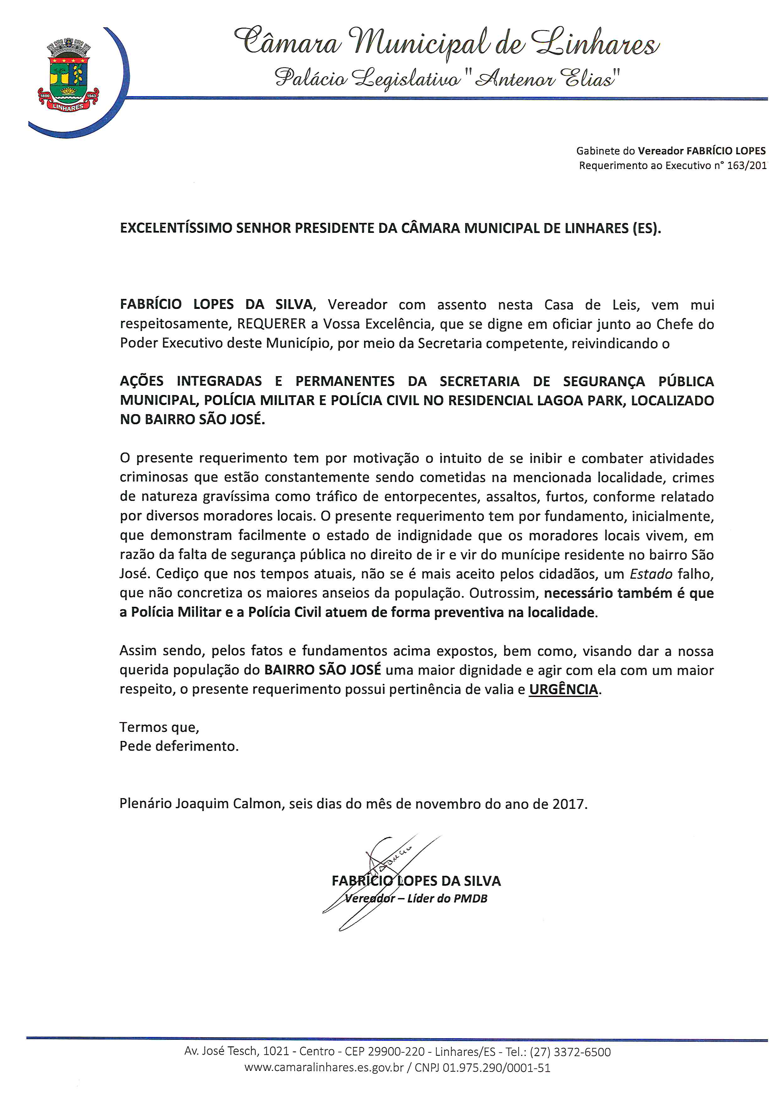 Última Ação: Encaminho cópia do ofício n°0273/2017, protocolizado na Prefeitura Municipal de Linhares sob o n°008331/2017, no dia 15/05/2017.